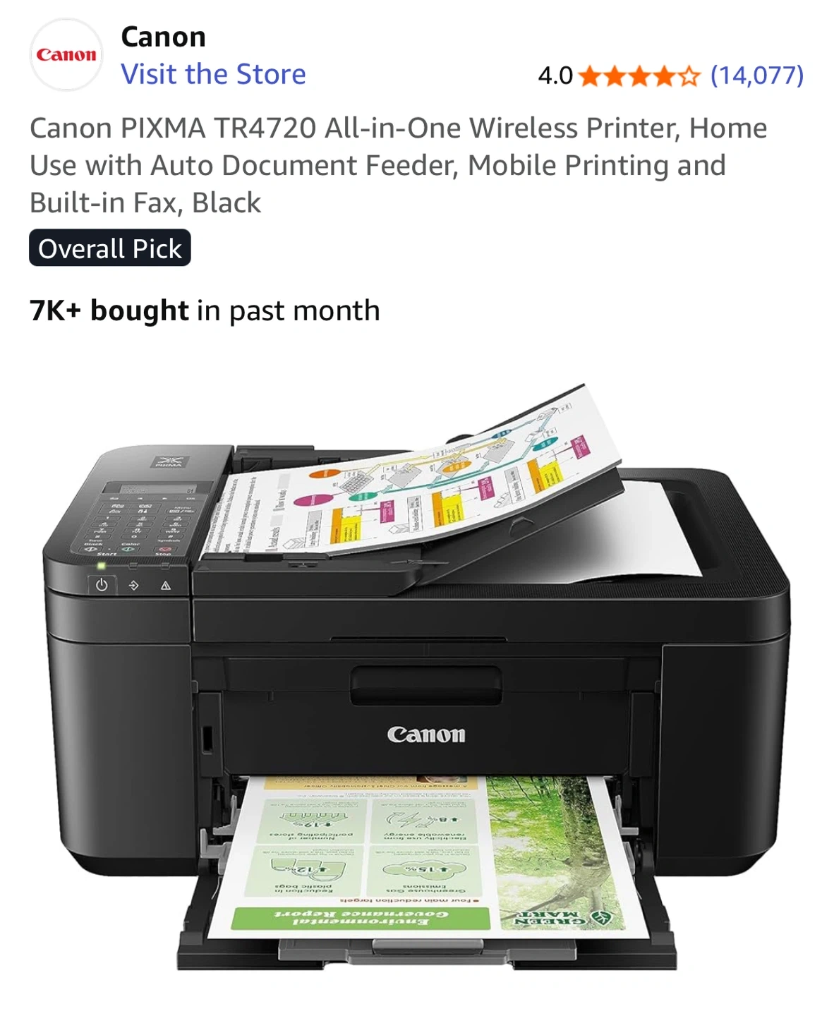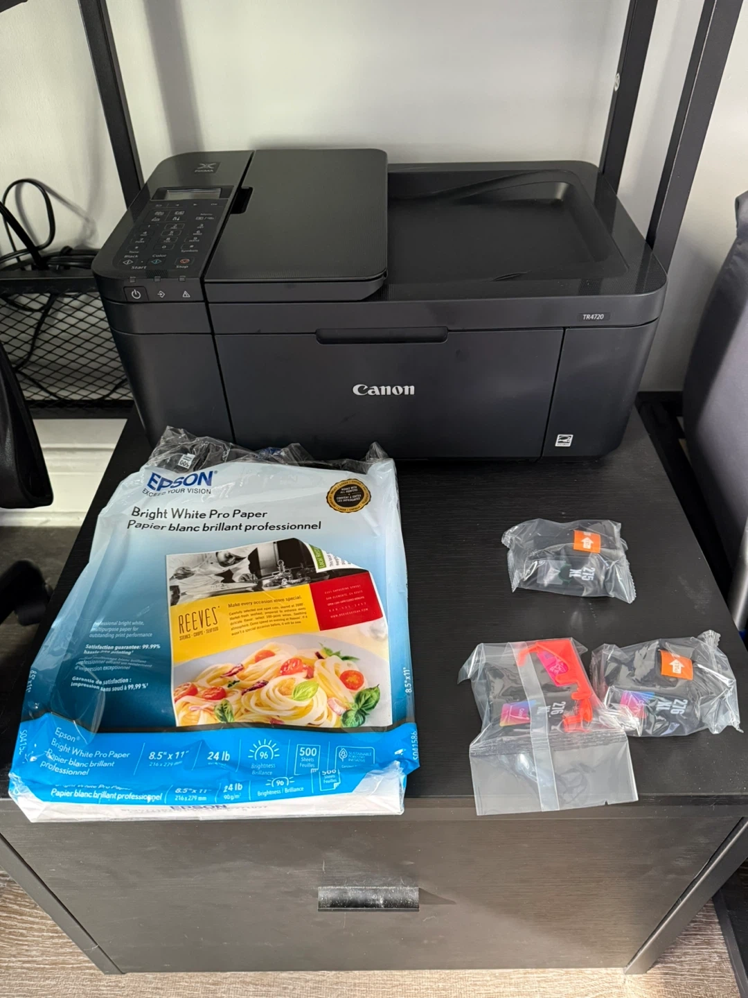 Comes with paper and 3 new ink cartridges. Selling a Canon PIXMA TR4720 all-in-one wireless printer in black. It's perfect for home use with auto document feeder and mobile printing. It also has a built-in fax. Includes some bright white pro paper and ink cartridges.