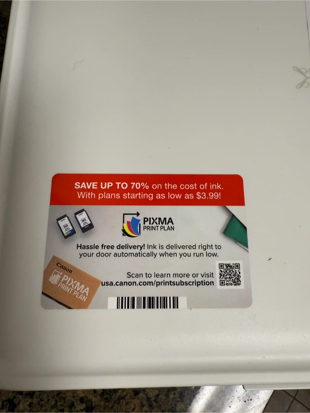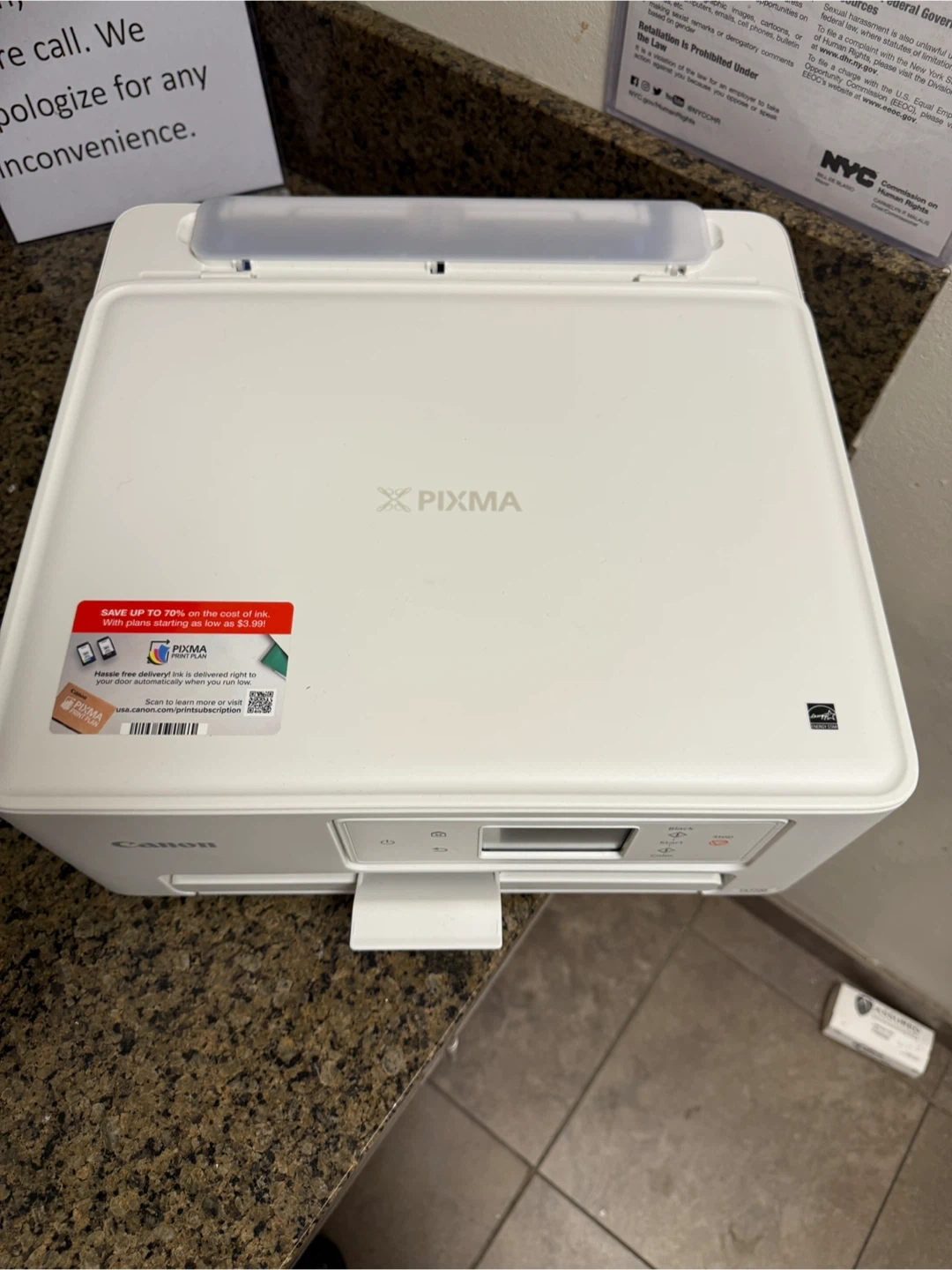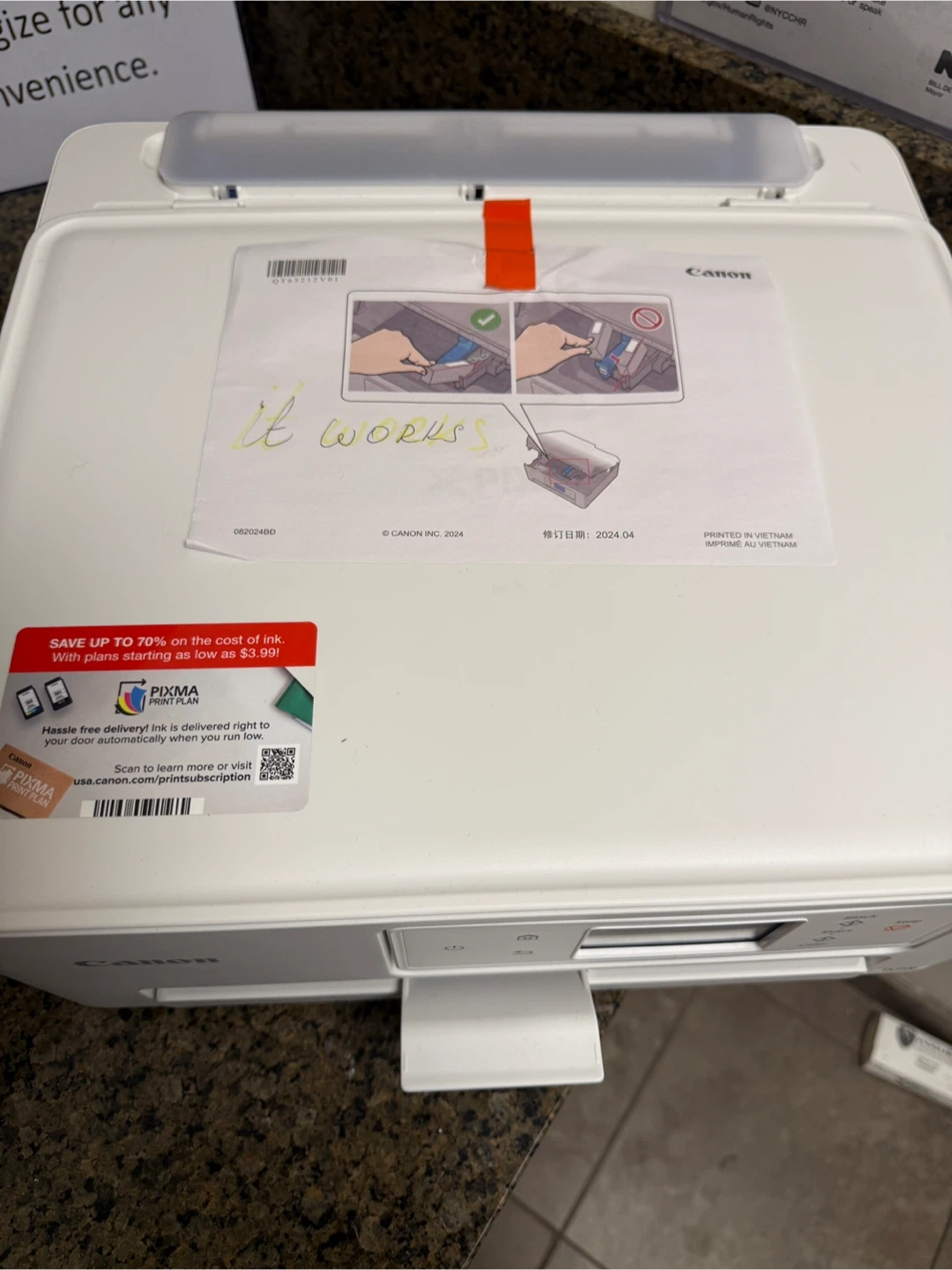 79Selling a Canon PIXMA TS7720 wireless all-in-one printer in white. It's in good working condition. It also has a PIXMA Print Plan subscription available. The manufacturing date is 2024 April