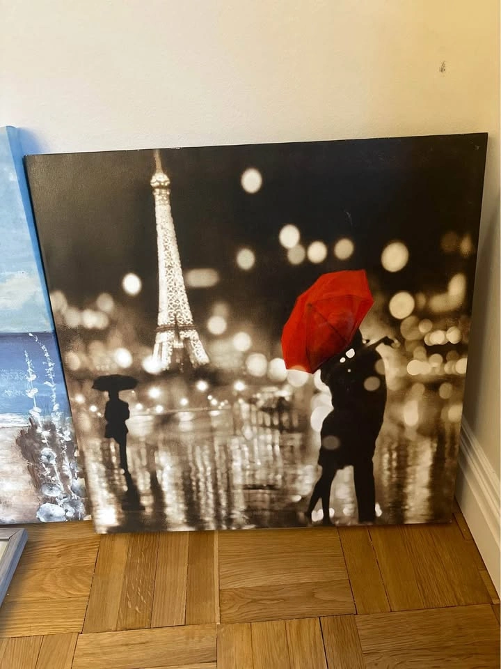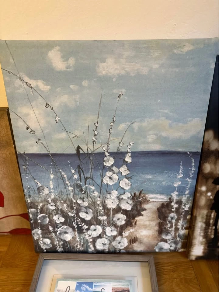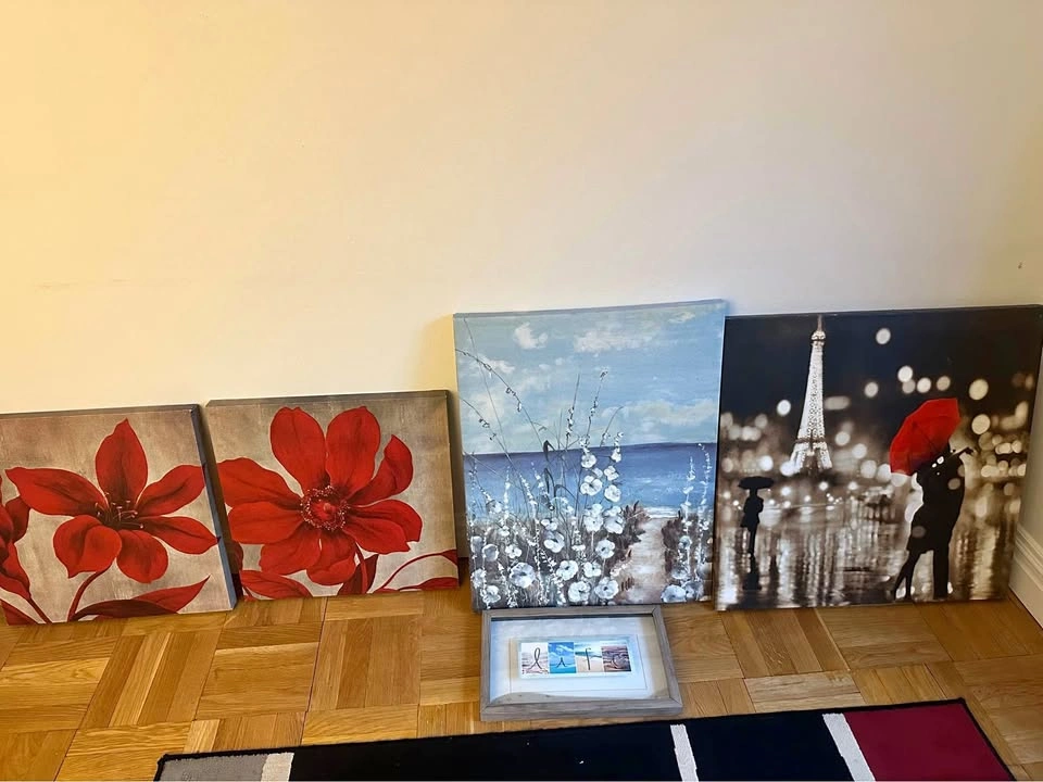 92All are in good condition; no marks or scrapes. Pickup on 45th between 8 and 9th avenue. “Life” wall hanging with sand; 16x10 $20 “Red flower” canvas’” (2); 20x20 $30 as a set “Red umbrella under Eiffel tower”; 27x27 $20 “Beach”; 28x20 $20