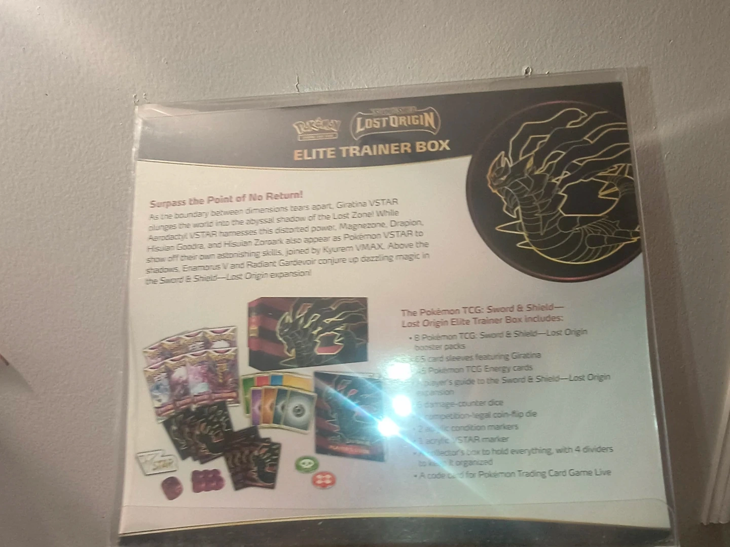 This Pokemon TCG: Sword & Shield—Lost Origin Elite Trainer Box includes 8 booster packs, 65 card sleeves featuring Giratina, 8 Pokemon TCG Energy cards, and a player's guide. It also comes with damage-counter dice, a competition-legal coin-flip die, 4 acrylic divider cards, and a collector's box with 4 dividers. A code card for Pokemon TCG Live is also included!