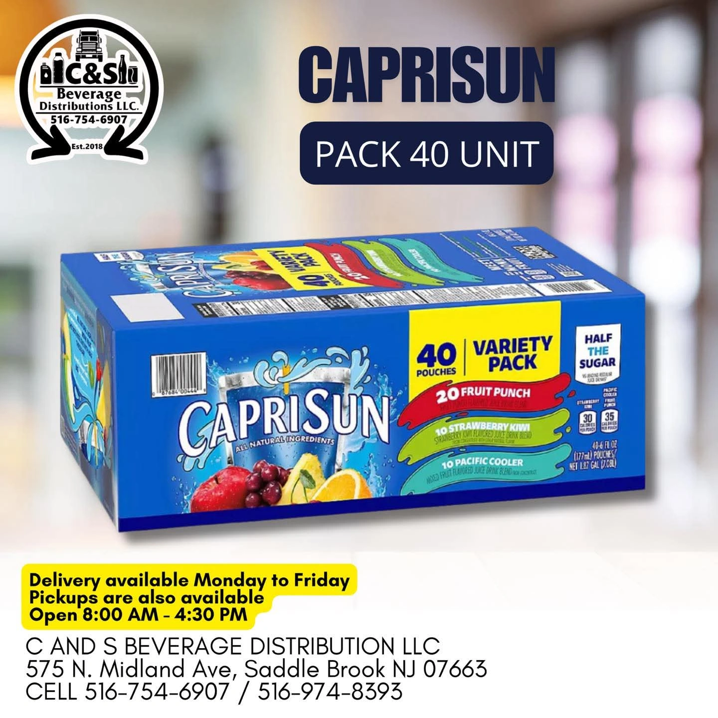 10Selling a Capri Sun Variety Pack containing 40 pouches! It includes: - 20 Fruit Punch - 10 Strawberry Kiwi - 10 Pacific Cooler Each pouch is 6 fl oz (177ml) for a total of 1.87 gallons
