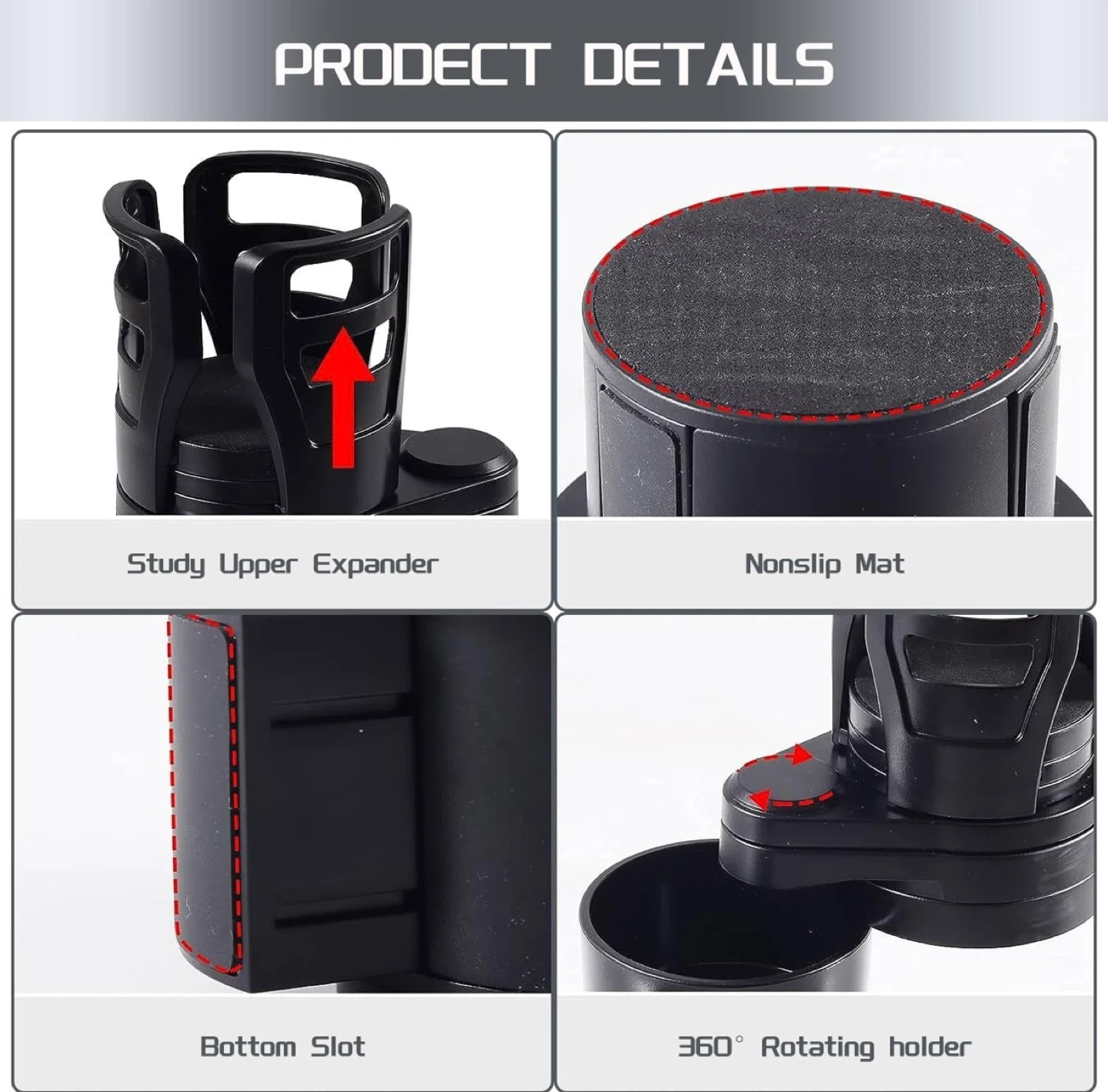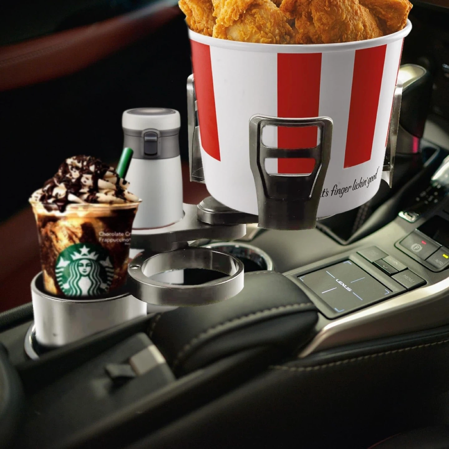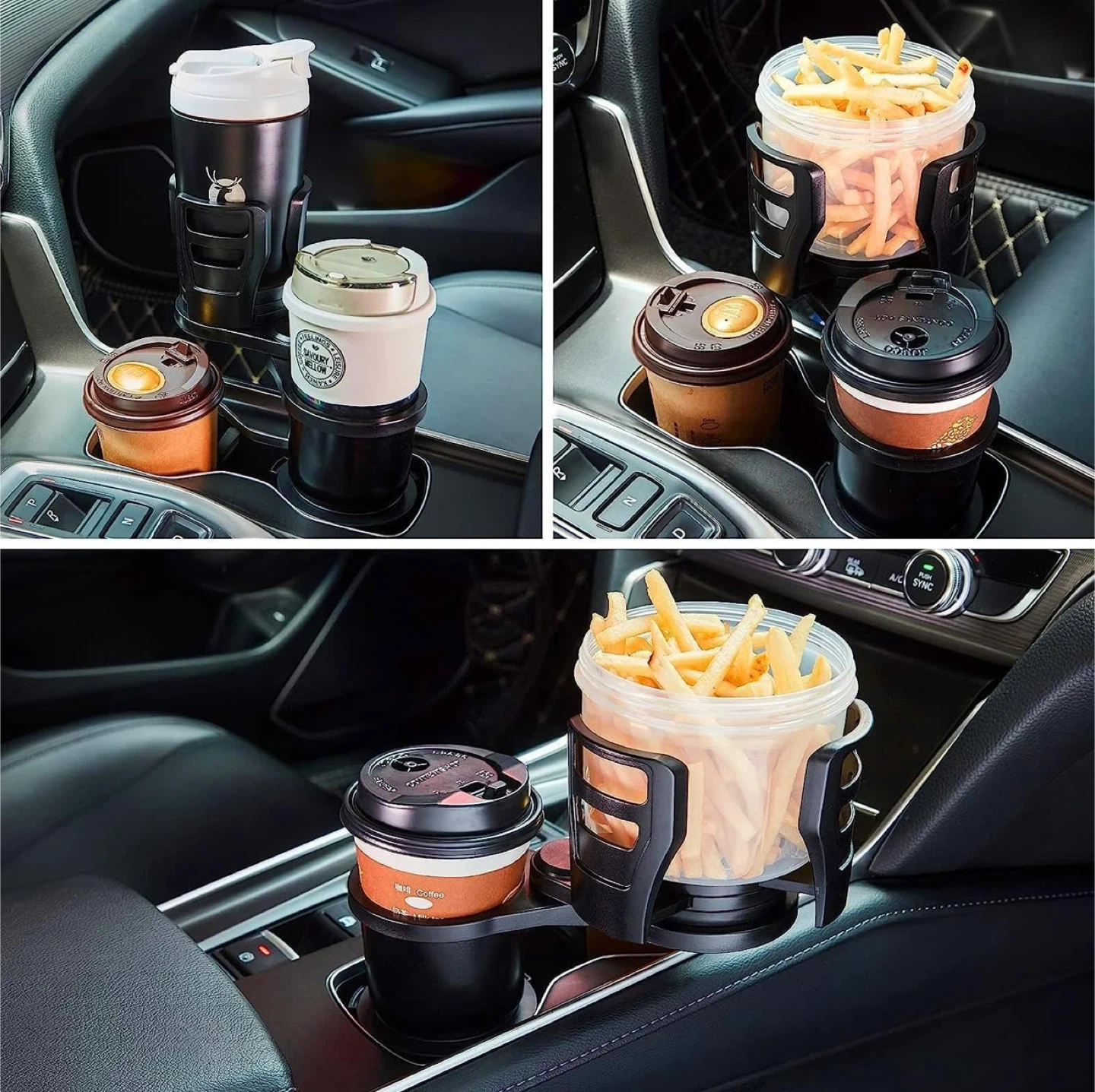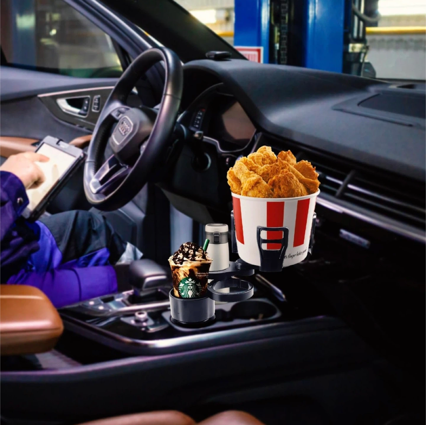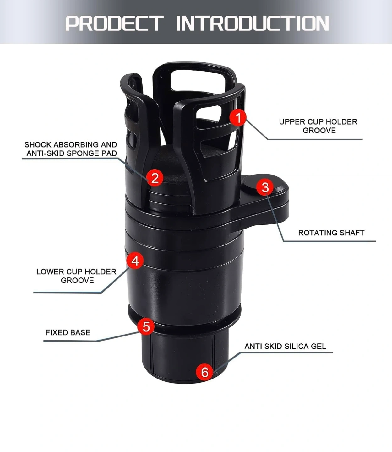 15This car cup holder adapter expands to fit larger cups and bottles. It has an adjustable base to fit securely in your car's existing cup holder. Features include a shock absorbing and anti-skid sponge pad, rotating shaft, and anti-skid silica gel to keep your drinks stable while driving