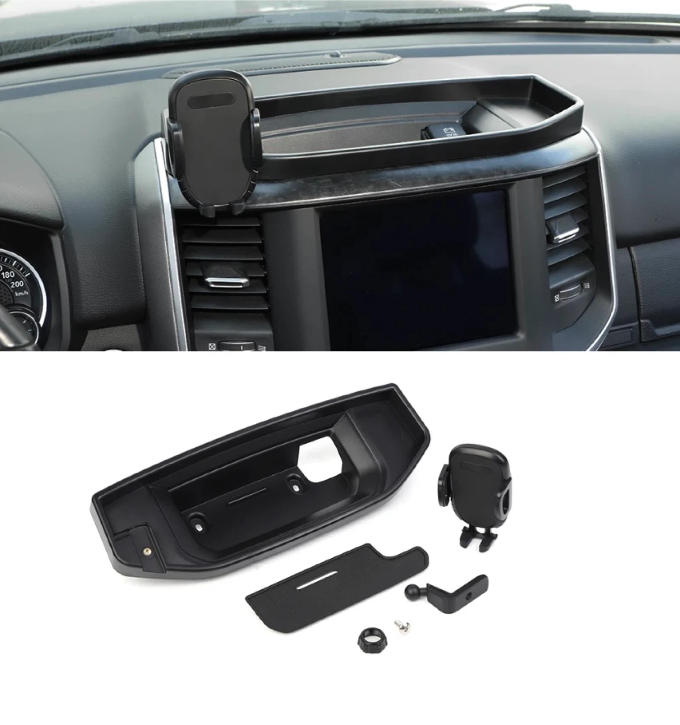 60The product is a black center console storage box mobile phone bracket mount designed for Dodge Ram 1500 2018-2023. It is an aftermarket branded item made with durable ABS materials. This direct replacement part features an original size design that fits perfectly and offers easy installation in just a couple of minutes. The multi-functional off-road bracket provides classified storage to keep the car more tidy and organized, making it a convenient and practical addition for drivers looking to enhance their vehicle's interior.