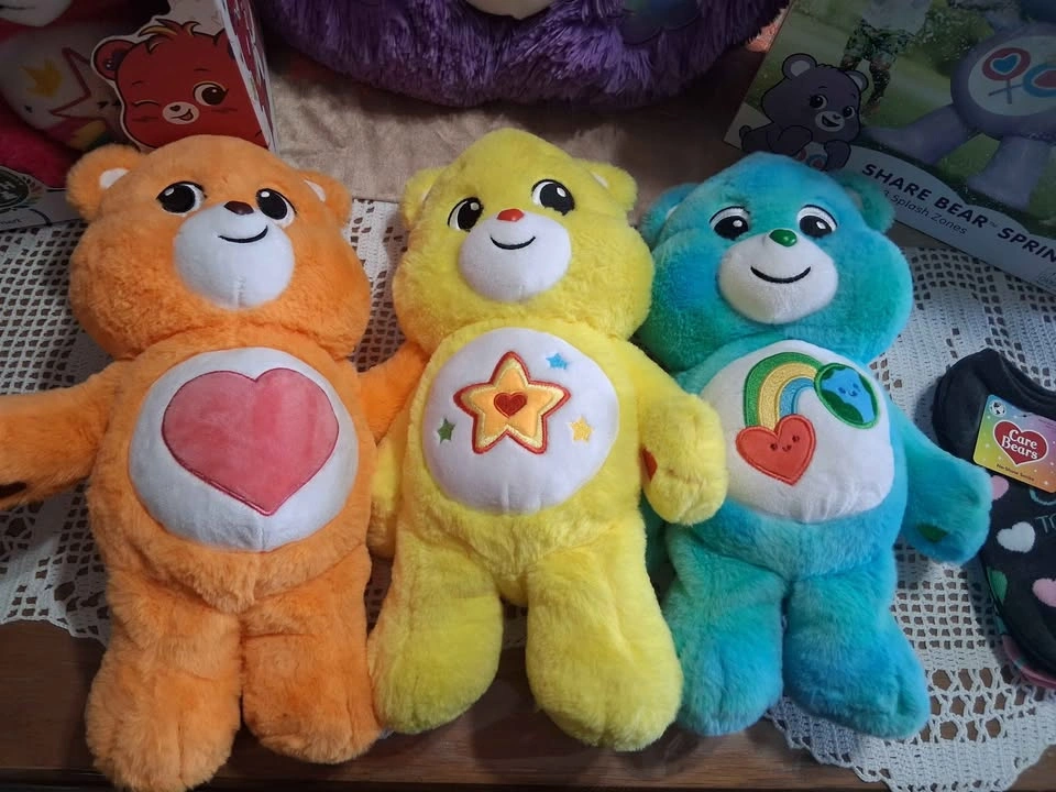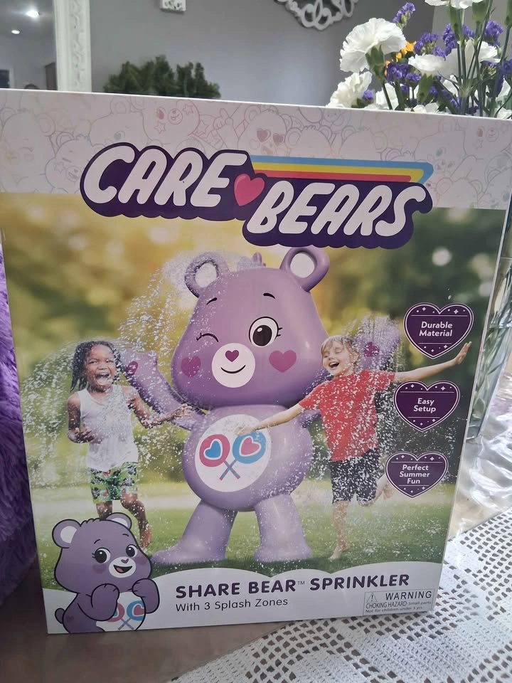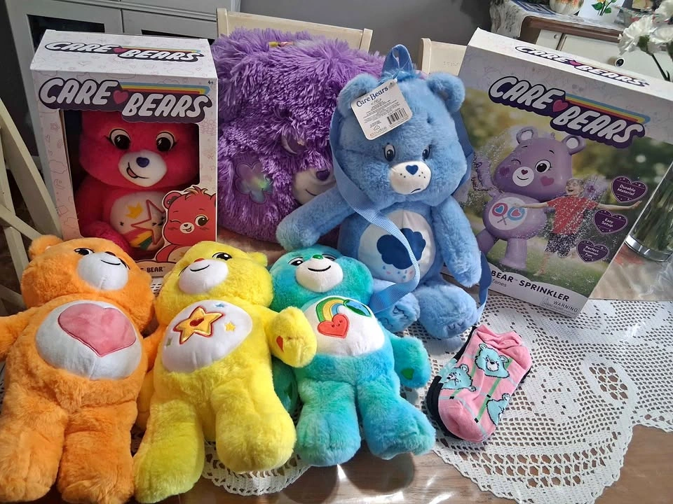 15Tons of carebears stuff for a big fan! Includes a big purple bear basket, purple bear sprinkler, blue bear backpack, pack of socks, new in box pink bear, and 3 more bears