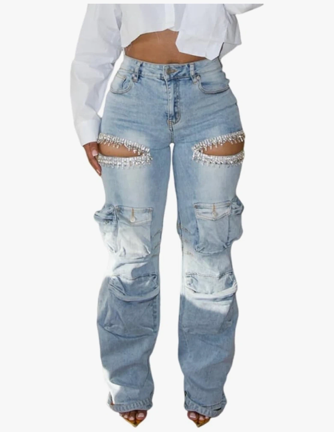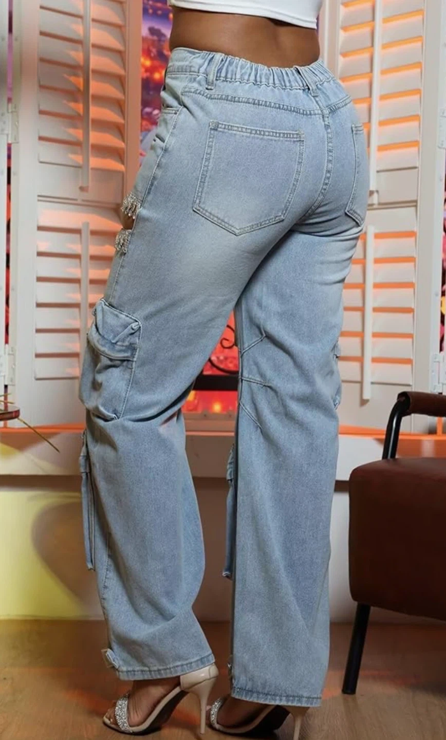 Brand New-** Light blue cargo jeans with rhinestone detailing! They're a size medium and feature lots of pockets. Originally bought for $59.99