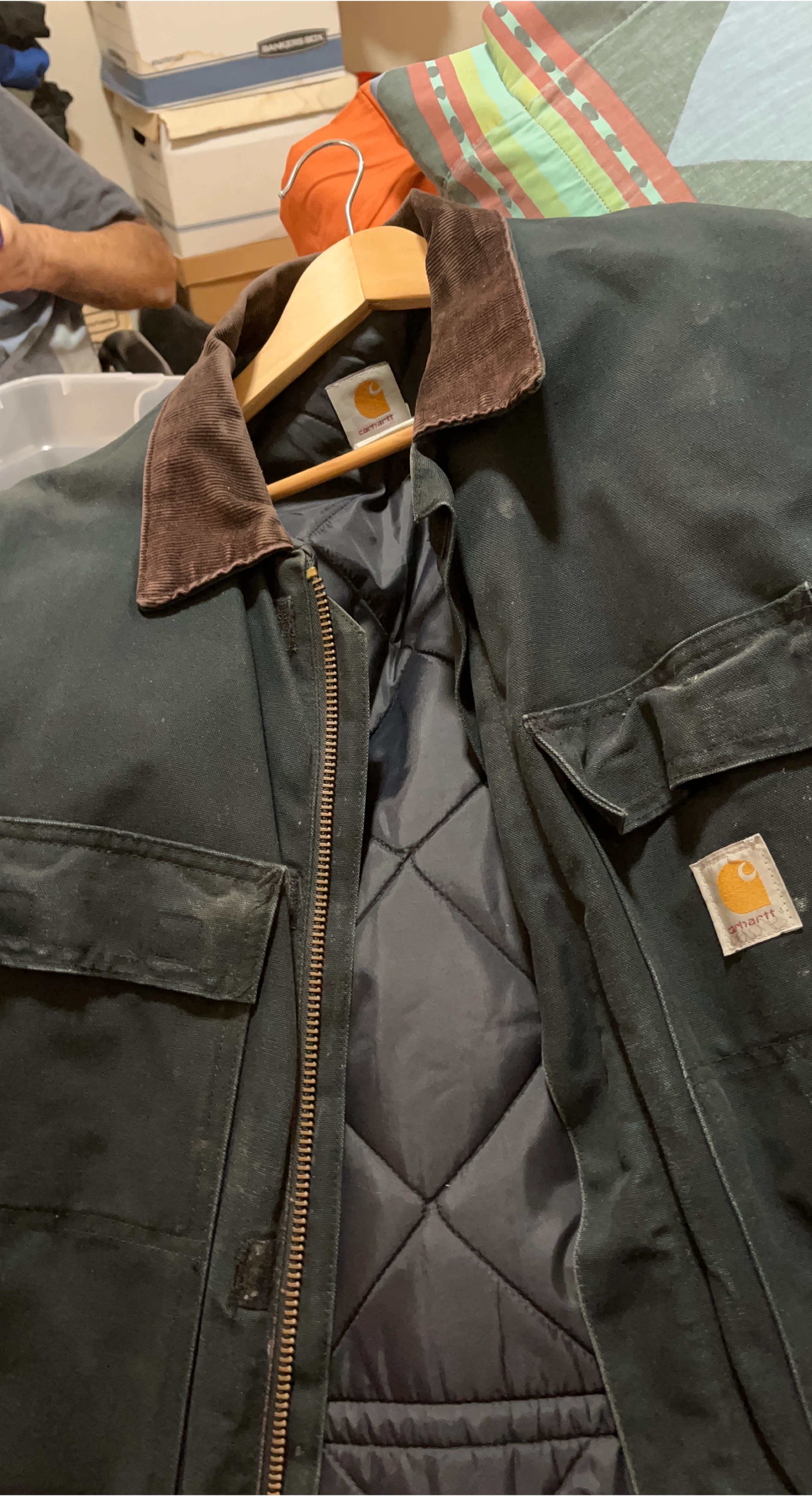 60Selling a Carhartt jacket. It has a corduroy collar and a quilted lining. It has some wear and tear, but still has a lot of life left in it!