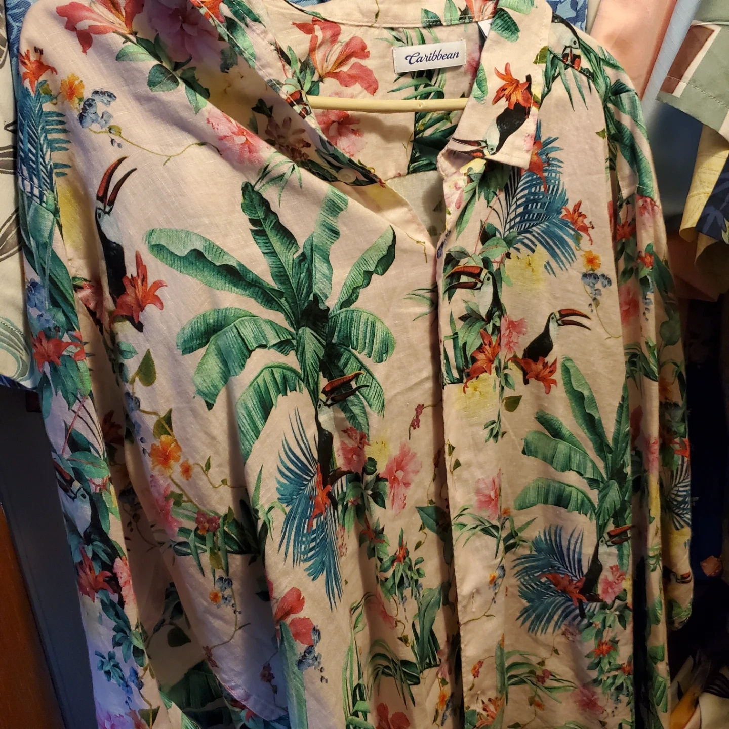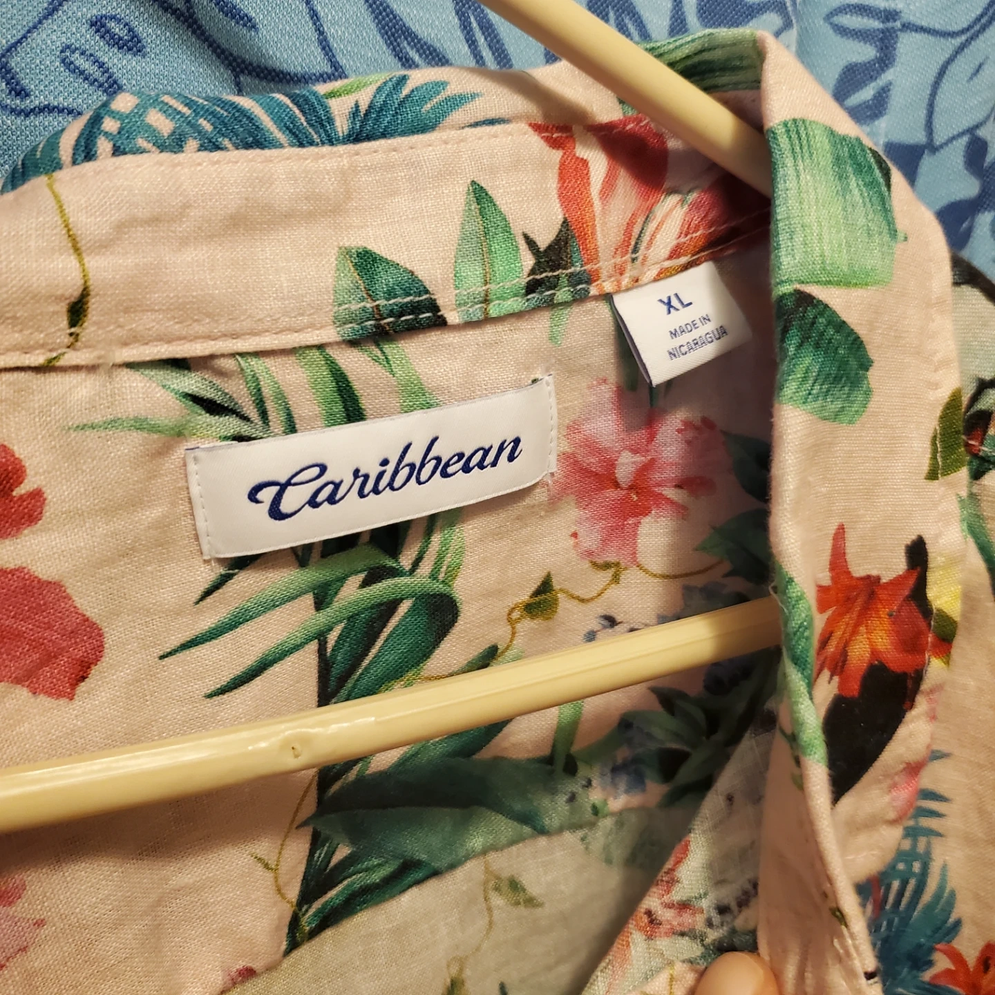 18Selling a gently used Caribbean floral shirt in size XL. The shirt features a vibrant floral pattern with palm trees and toucans. It's made in Nicaragua and perfect for a casual, tropical look. The shirt is in great condition!