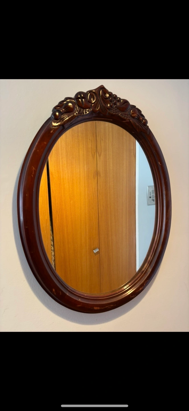 70Oval mirror. Dark wood frame. Decorative carvings at the top. 28x22”