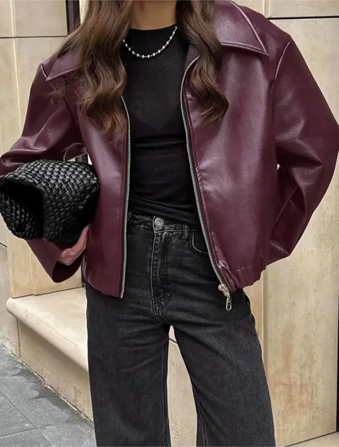 Selling a Carmesi burgundy faux leather jacket in size S. It's a stylish piece that would look great in your wardrobe!
