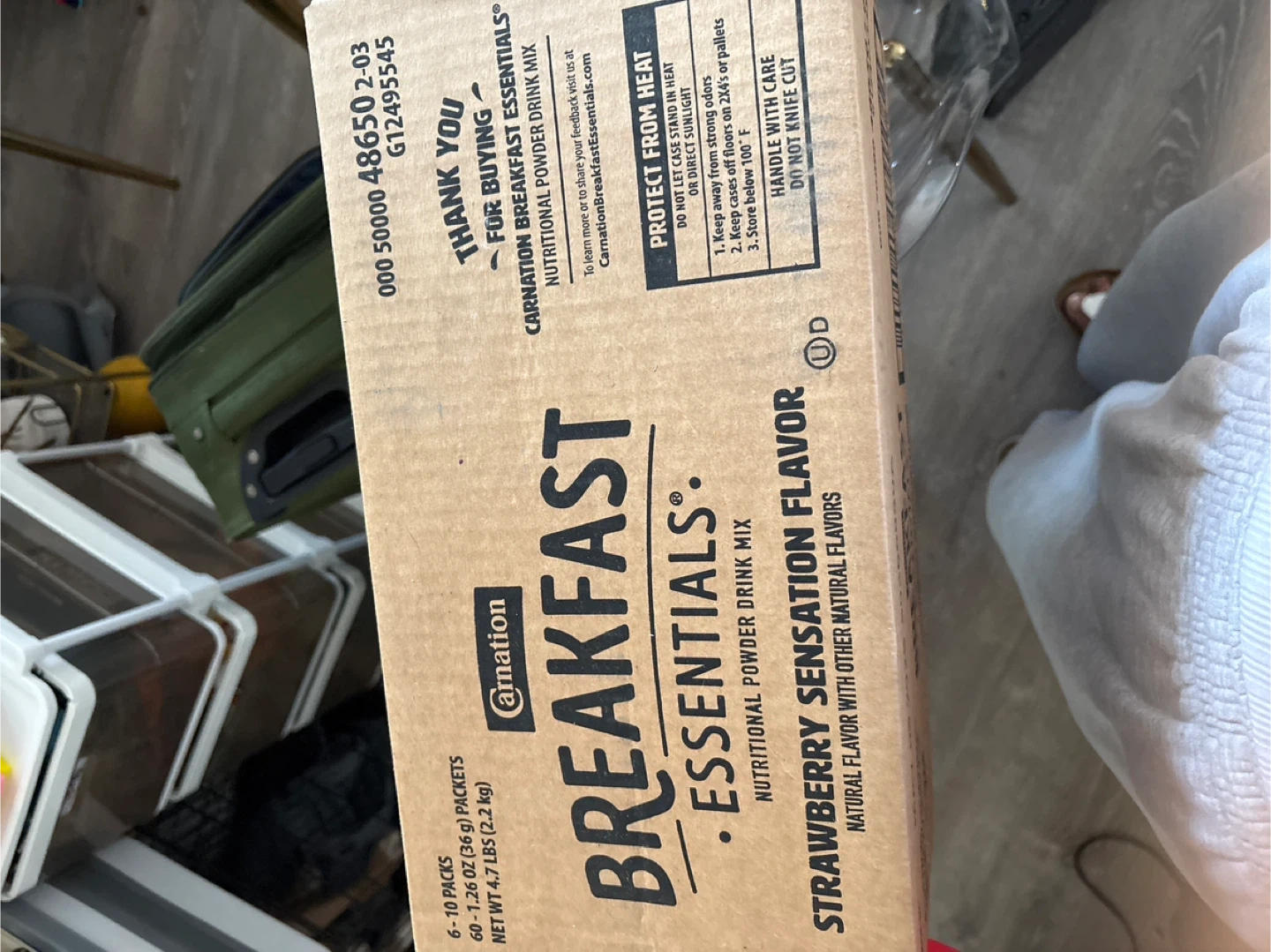 Selling a box of Carnation Breakfast Essentials in Strawberry Sensation flavor! This nutritional powder drink mix contains 6-10 packs with a net weight of 4.7 lbs (2.2 kg). Perfect for a quick and nutritious breakfast on the go