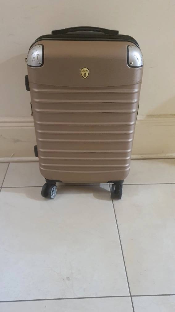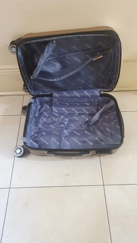 92Selling a deJuno carry-on suitcase in brown. It's a hardside suitcase with wheels and a retractable handle. The handle sticks slightly when lowering. Otherwise, it is in perfect condition. 13,5"×9,5" 22" height