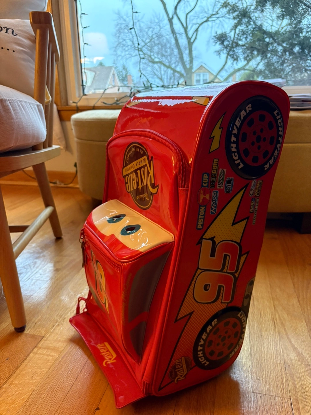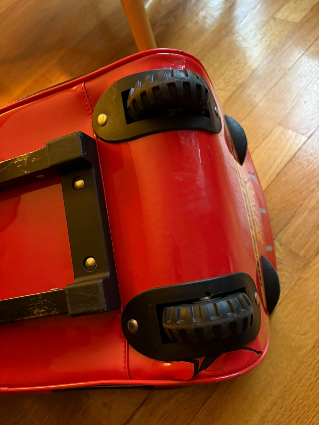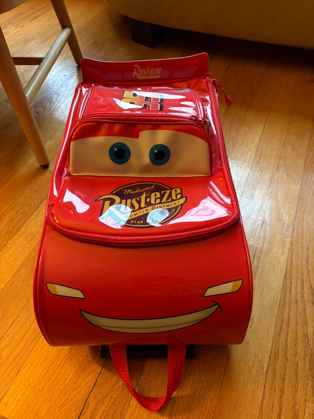 Red rolling suitcase. Features Lightning McQueen. Small front pocket. Wheels and handle. Great for kids. In great shape. When I bought it I didn’t notice there was tear by the wheel. It doesn’t affect the overall use of it.
