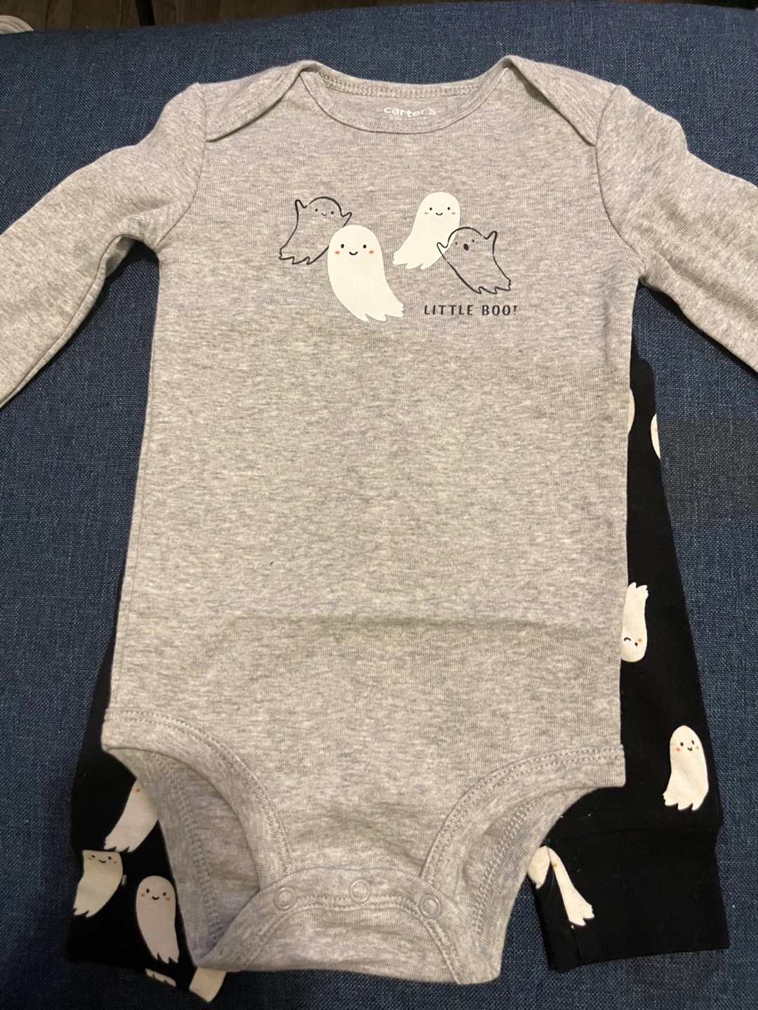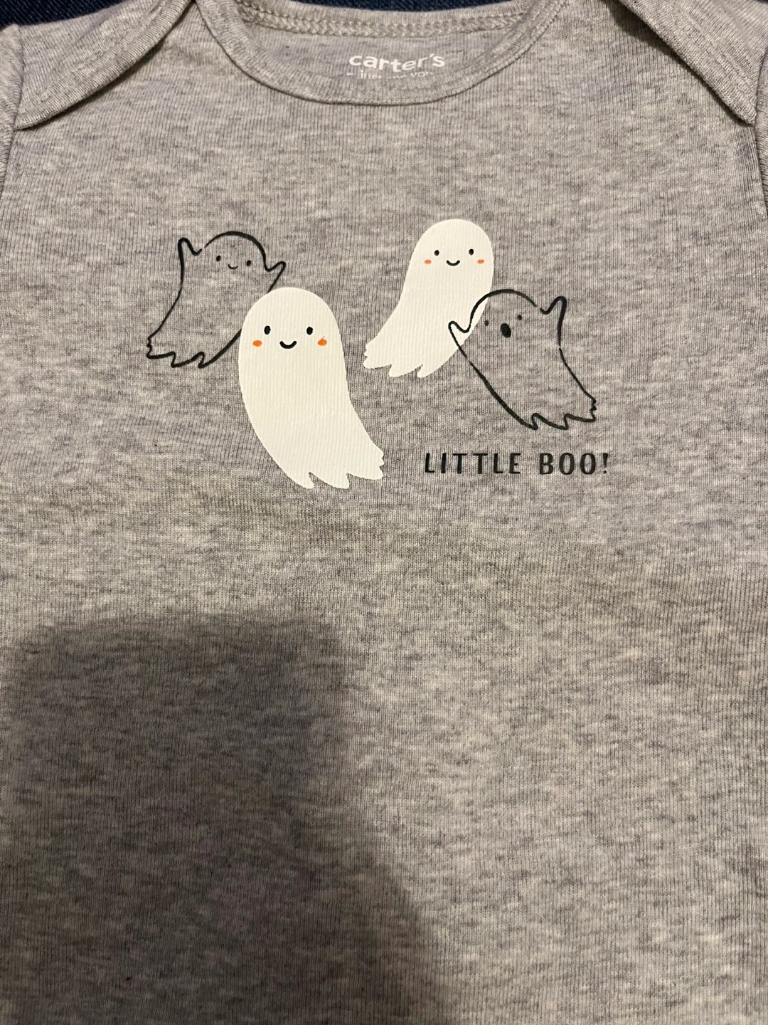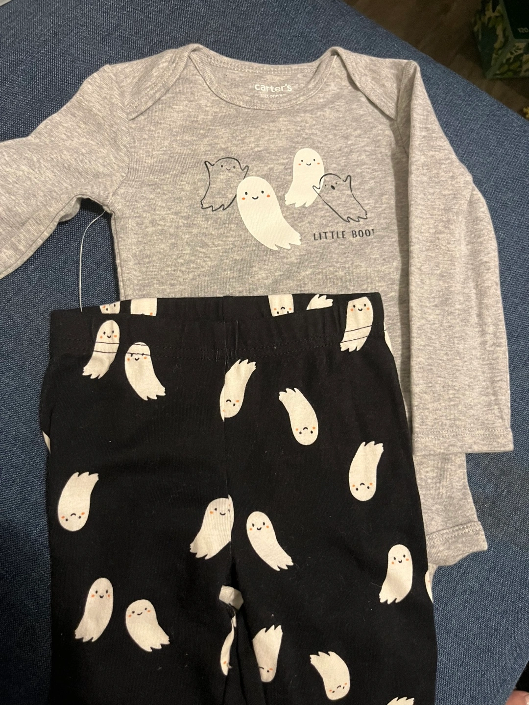 Adorable Carter's baby outfit. Size 12 months. Grey bodysuit features a cute ghost design, saying "Little Boo!" Black leggings with all-over ghost print. Brand New, never worn. Retail Price $20, cash only.