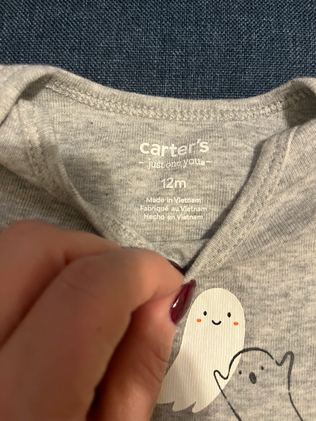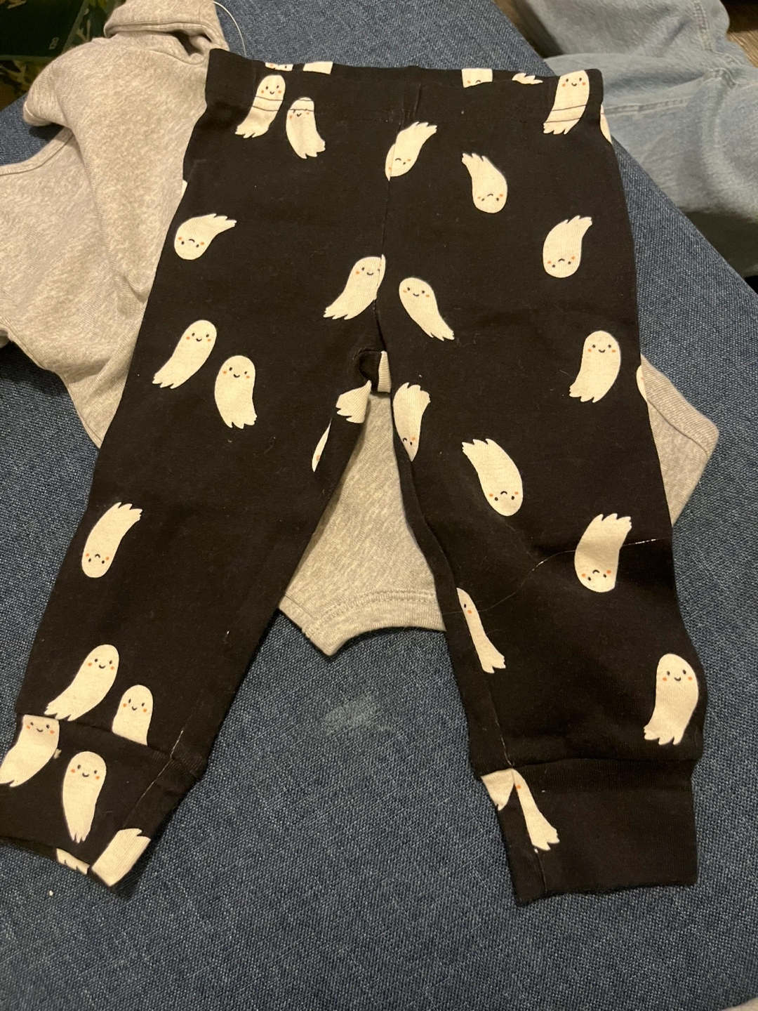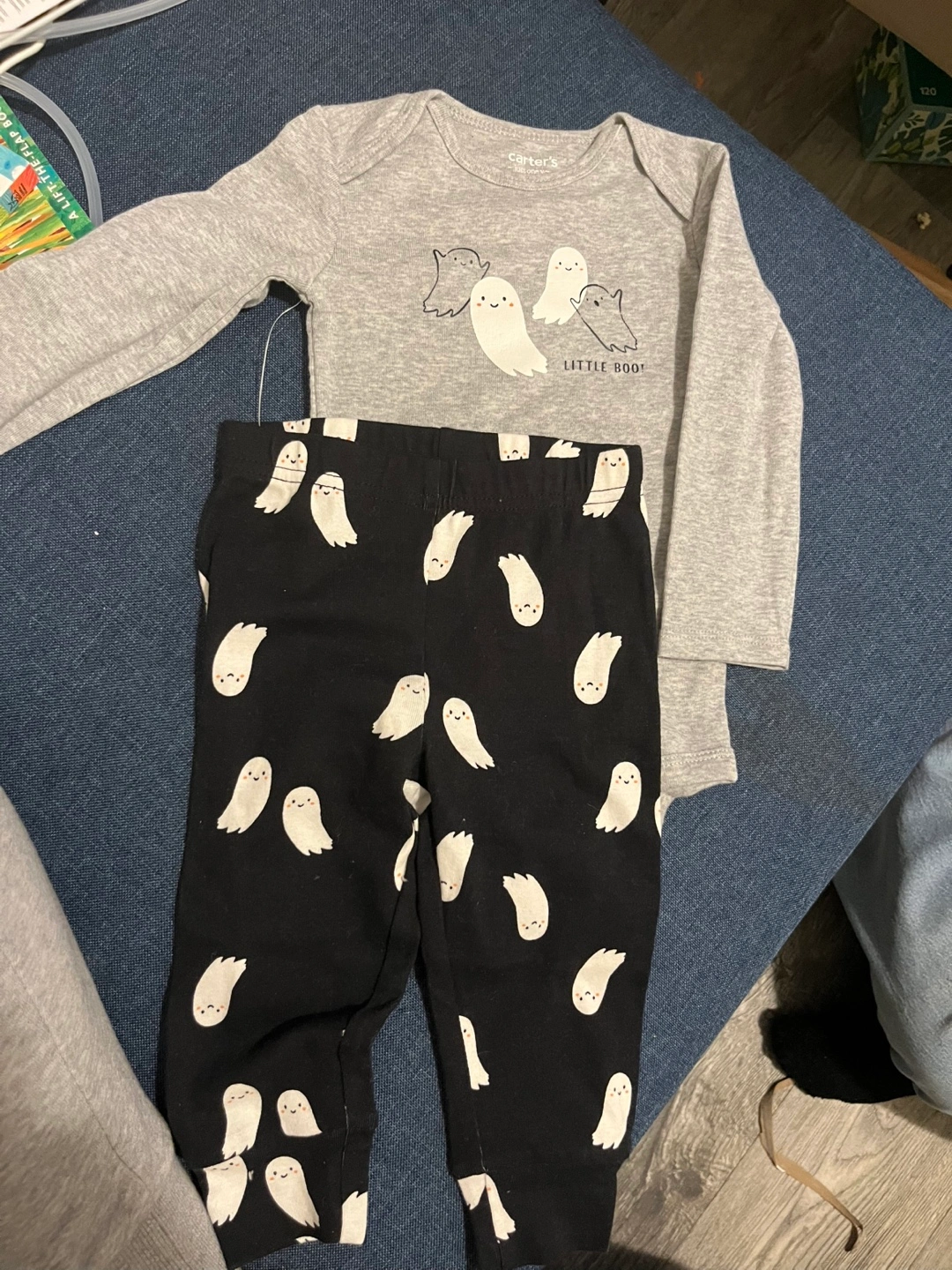 Adorable Carter's baby outfit. Size 12 months. Grey bodysuit features a cute ghost design, saying "Little Boo!" Black leggings with all-over ghost print. Brand New, never worn. Retail Price $20, cash only.