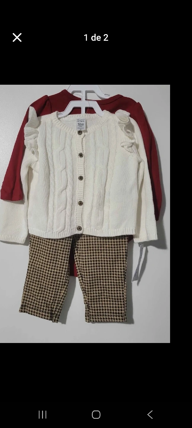 10Cute Carter's outfit set for a 12-month-old! Includes a cream-colored cardigan with a cable knit design and ruffle details, a red long-sleeved bodysuit, and brown houndstooth pants