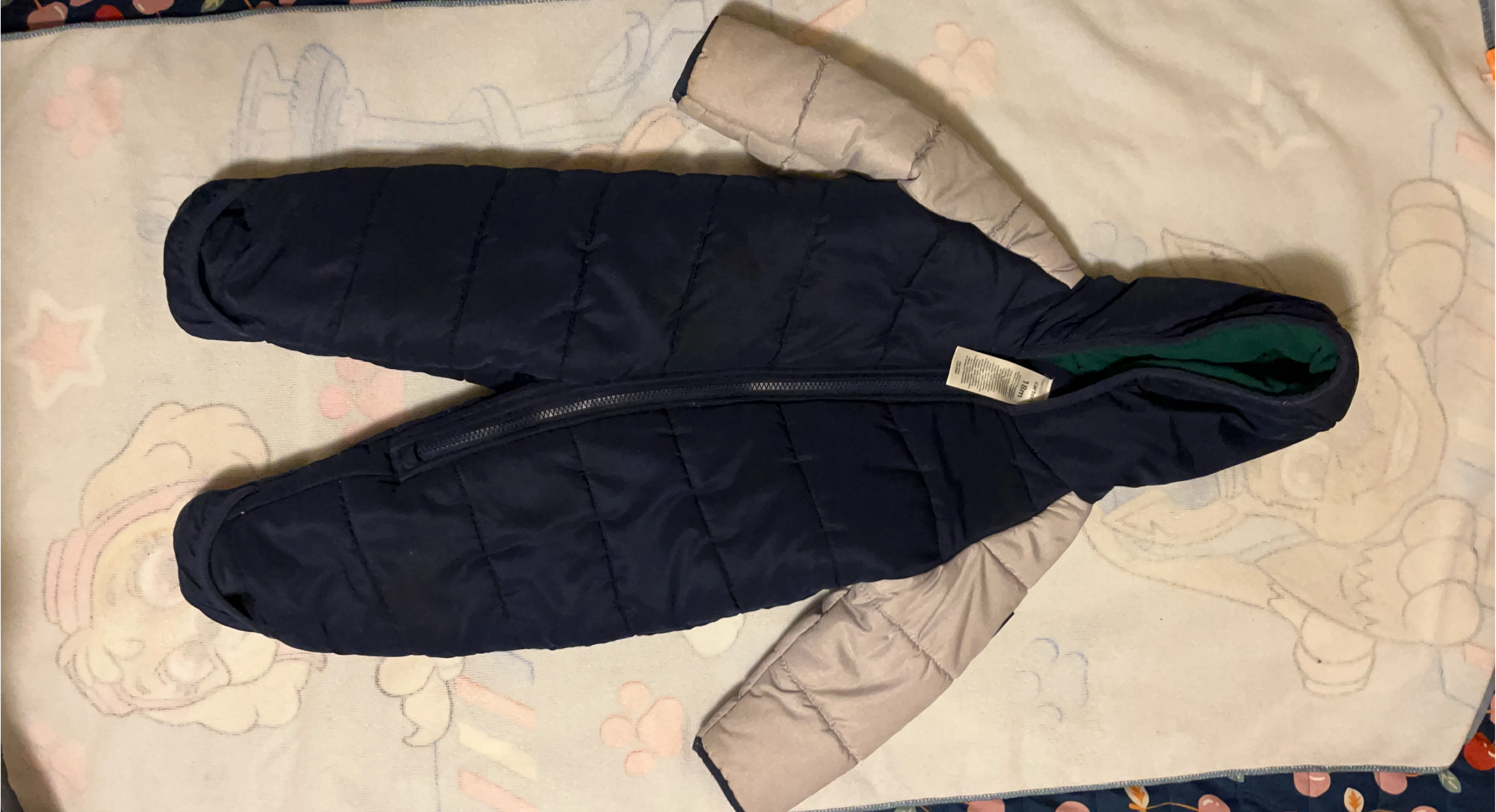 Carter's puffer snowsuit in size 18 months. It's navy blue with beige sleeves and a cozy green lining. Perfect for keeping your little one warm!