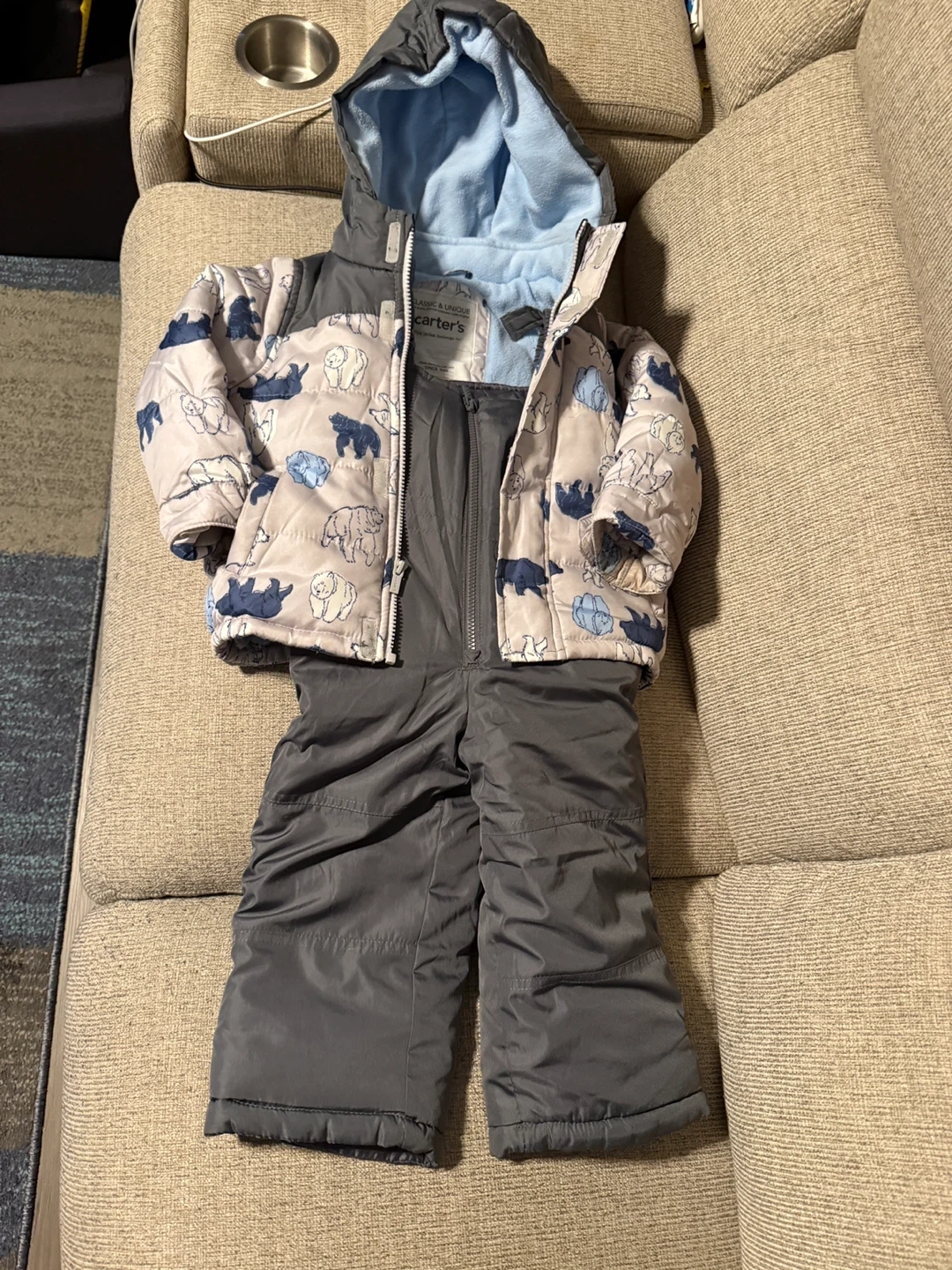 Selling a Carter's snowsuit set in size 3T. The set includes a jacket with a hood and snow pants. The jacket is patterned with bears and has a gray hood and top section. The snow pants are a solid gray color. Perfect for keeping your little one warm this winter!