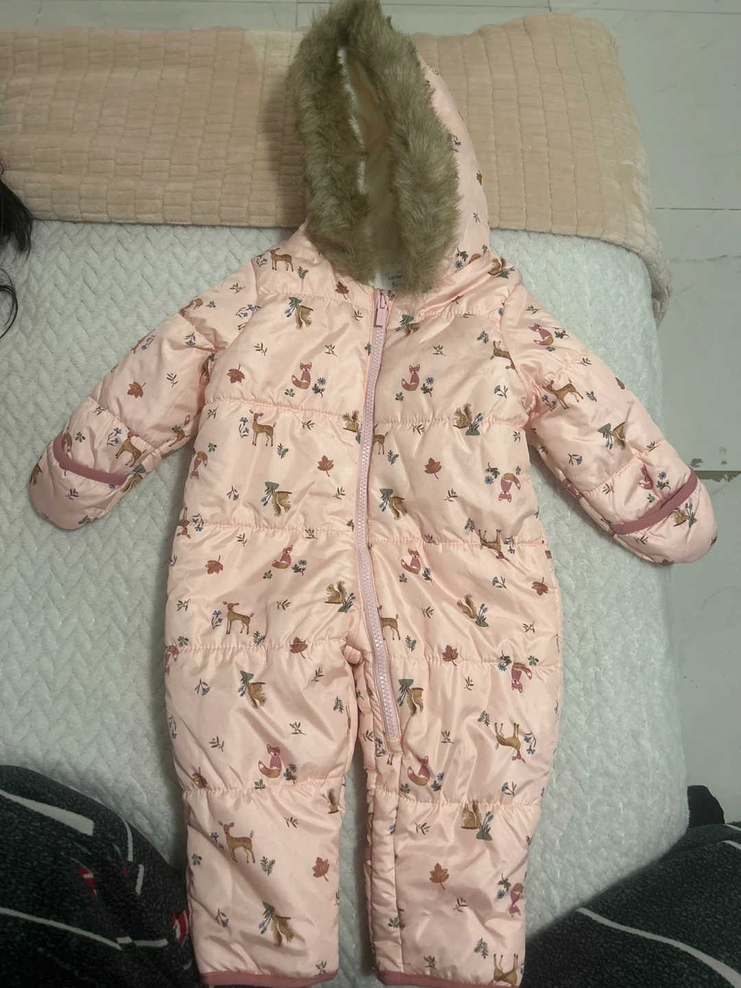 10This is a Carter's snowsuit in size 9M. It features a cute pink animal print and a cozy hood with faux fur trim. Perfect for keeping your little one warm this winter!