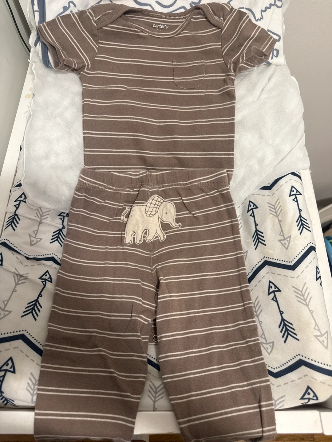 Here's a super cute Carter's outfit! It features a brown and white striped top and matching pants with an adorable elephant design. Perfect for your little one!
