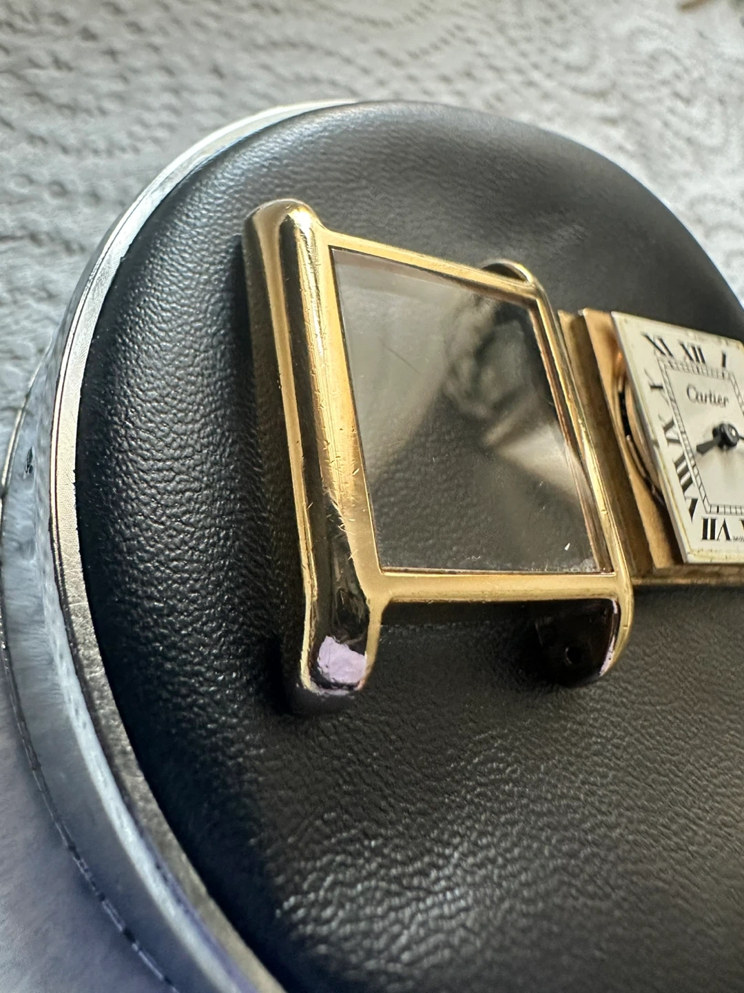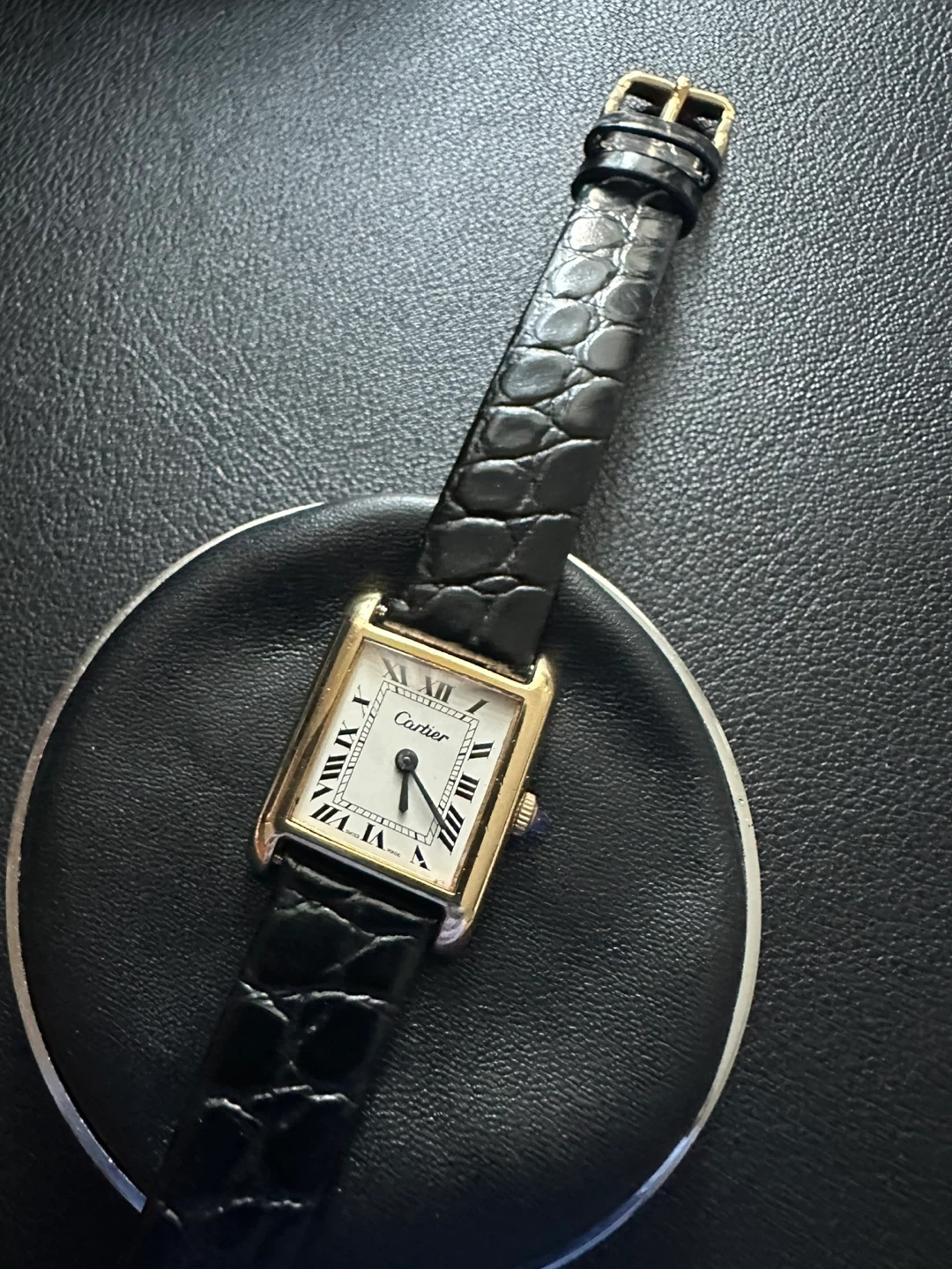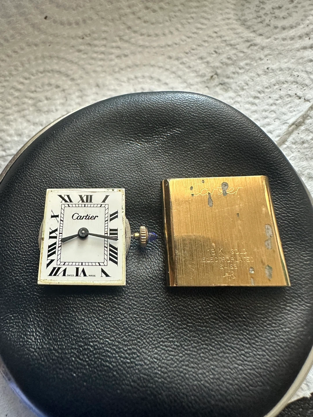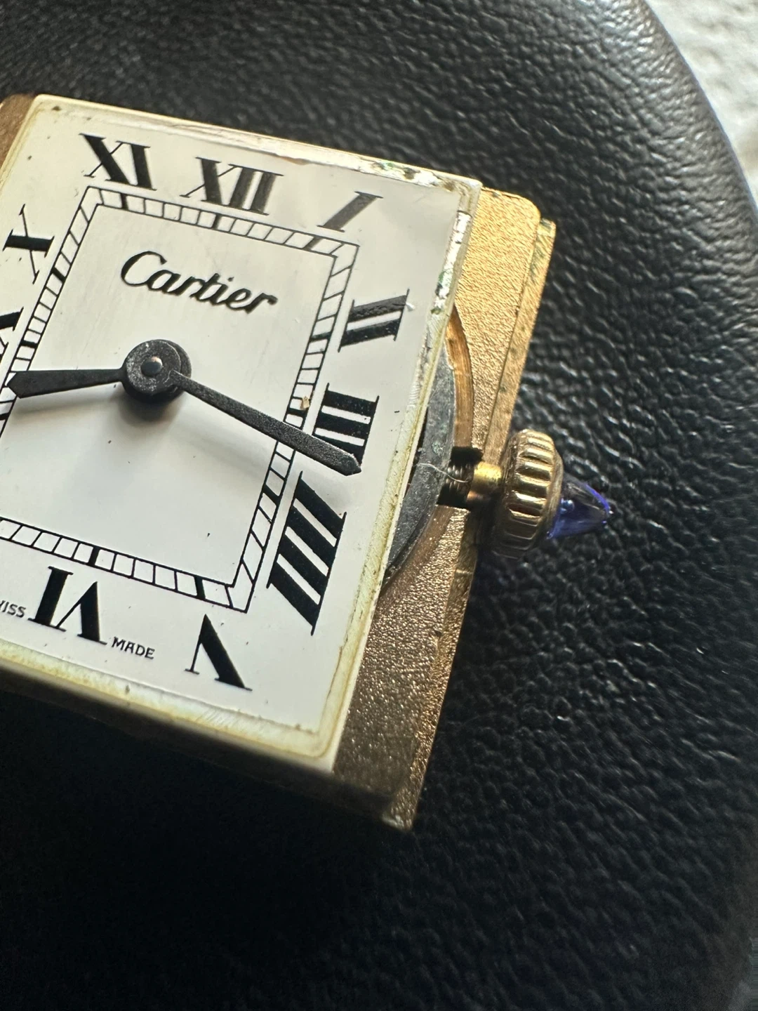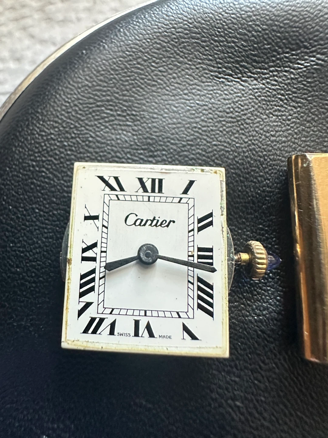 Selling a vintage Cartier Tank style watch. The piece has a rectangular gold-plated case (marked Plaque OR G 20M) with Roman numeral dial and blue cabochon crown. The movement runs and has visible jewels, but based on markings and finishing, I believe this is not an authentic Cartier more likely a vintage homage/dupe from the 60s–80s era. • Mechanical hand-wind movement • working condition • Condition: scratches on back • Leather strap (well used) 💡 Pricing reflects that I consider this to be a dupe, not a guaranteed authentic Cartier. As-is sale, for collectors, vintage lovers, or someone who wants the Tank look without Cartier prices.