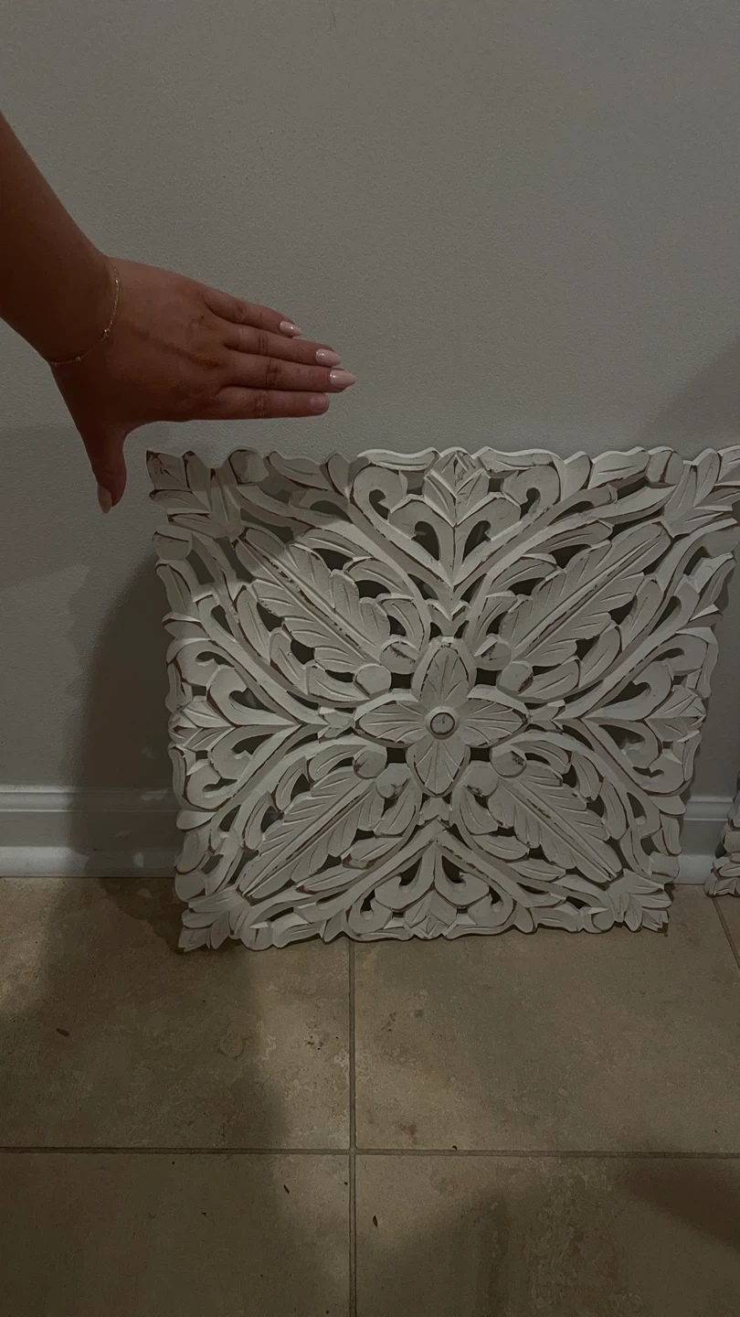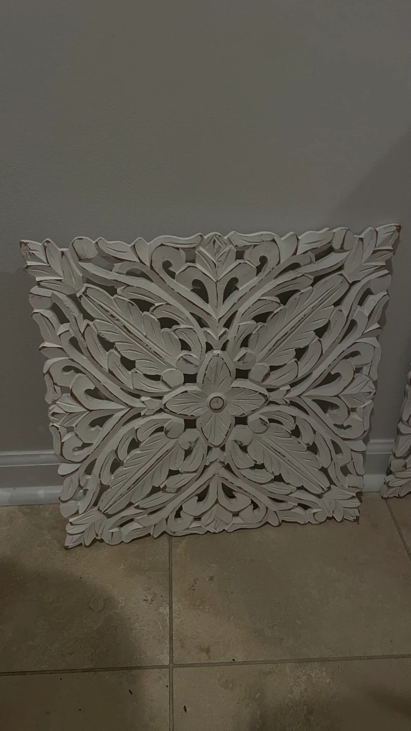 Selling a carved wood wall decor panel. It's in great condition and features a beautiful floral design. Perfect for adding a touch of elegance to any room