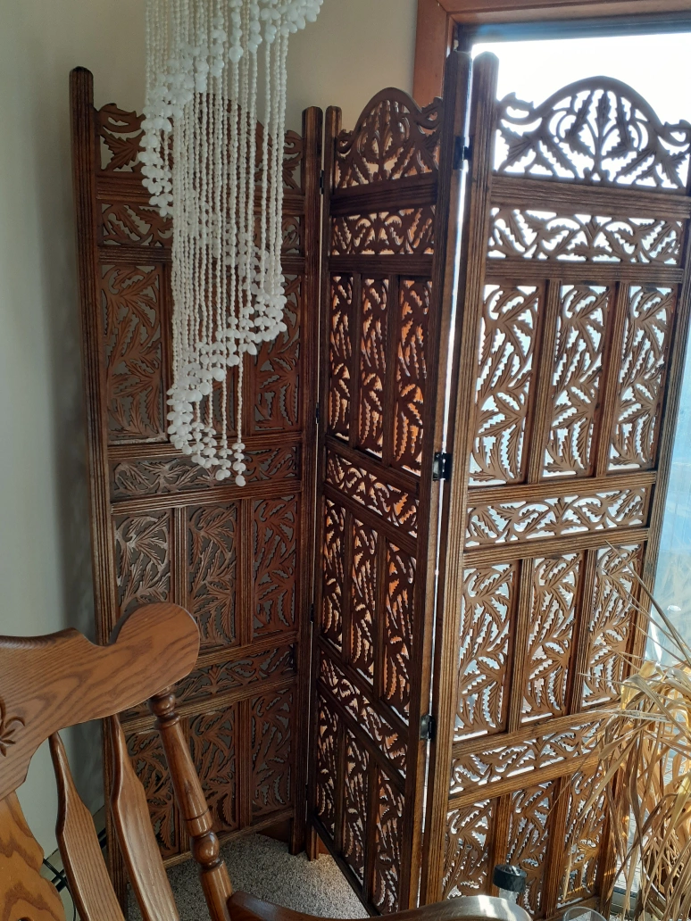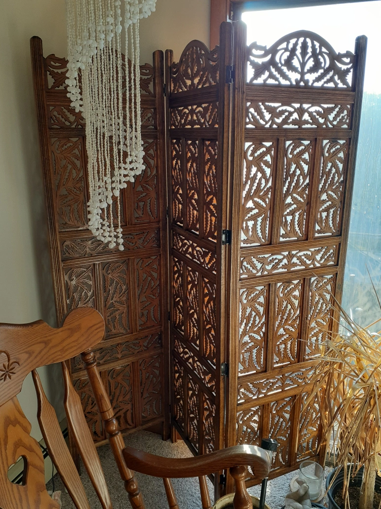 Selling a beautiful, carved wooden room divider screen. It's in Great condition and would be a lovely addition to any room. It features intricate carvings and a warm, natural wood tone. (sea shells not included or rocking chair).