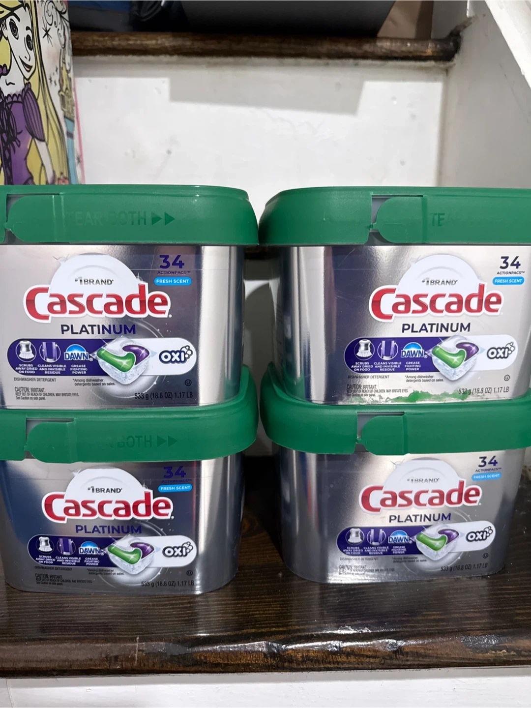 48I'm selling Cascade Platinum Actionpacs dishwasher detergent pods. Each container includes 34 pods with a fresh scent and Dawn grease fighting power. They also contain Oxi for stain removal and sparkling dishes