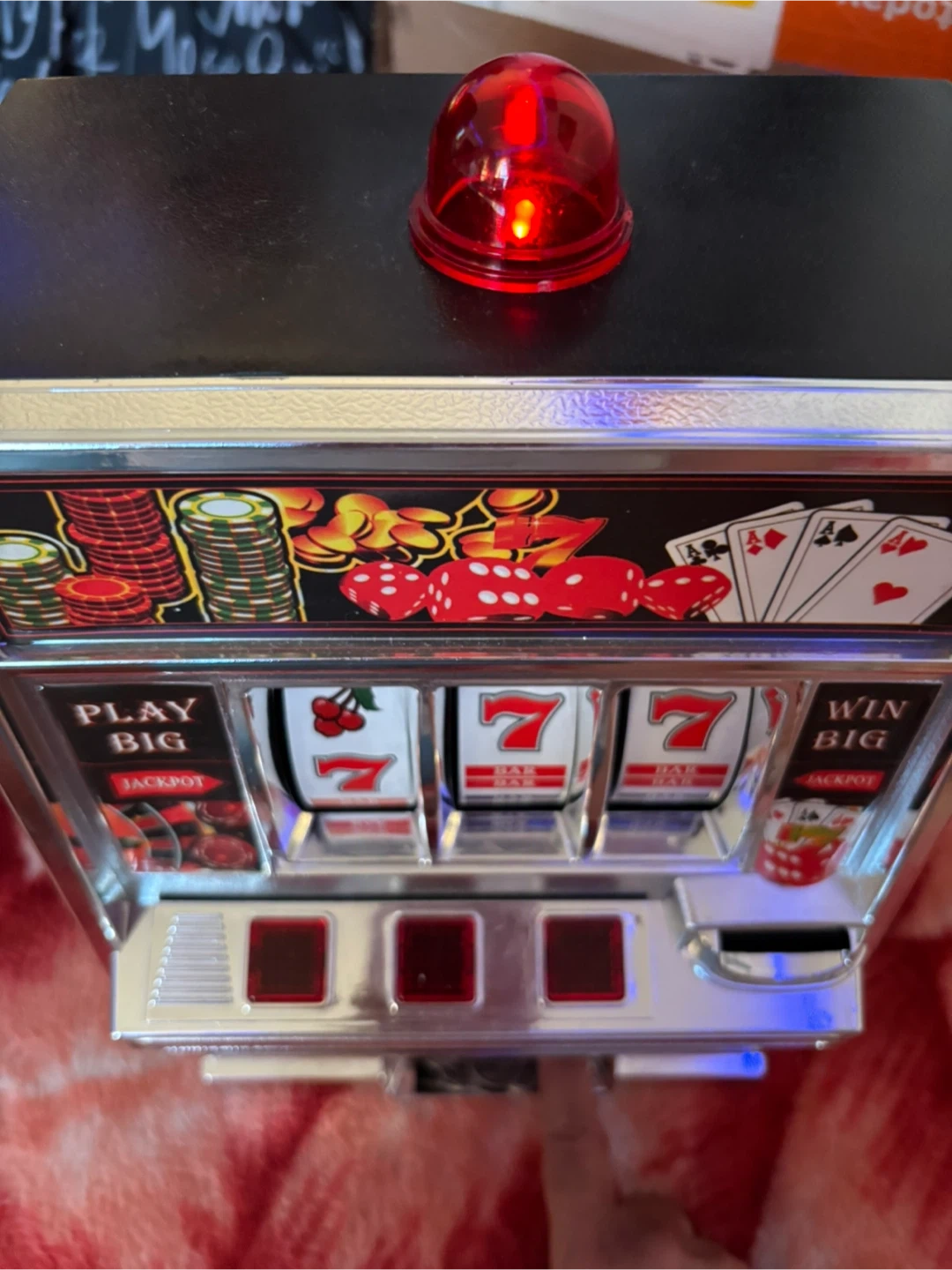 Selling a Casino Bandit slot machine. It has a classic casino theme with cherries, sevens, and bars on the reels. The machine features a pull lever and a coin slot for an authentic feel. Perfect for adding some fun to your game room! It is a bank.
