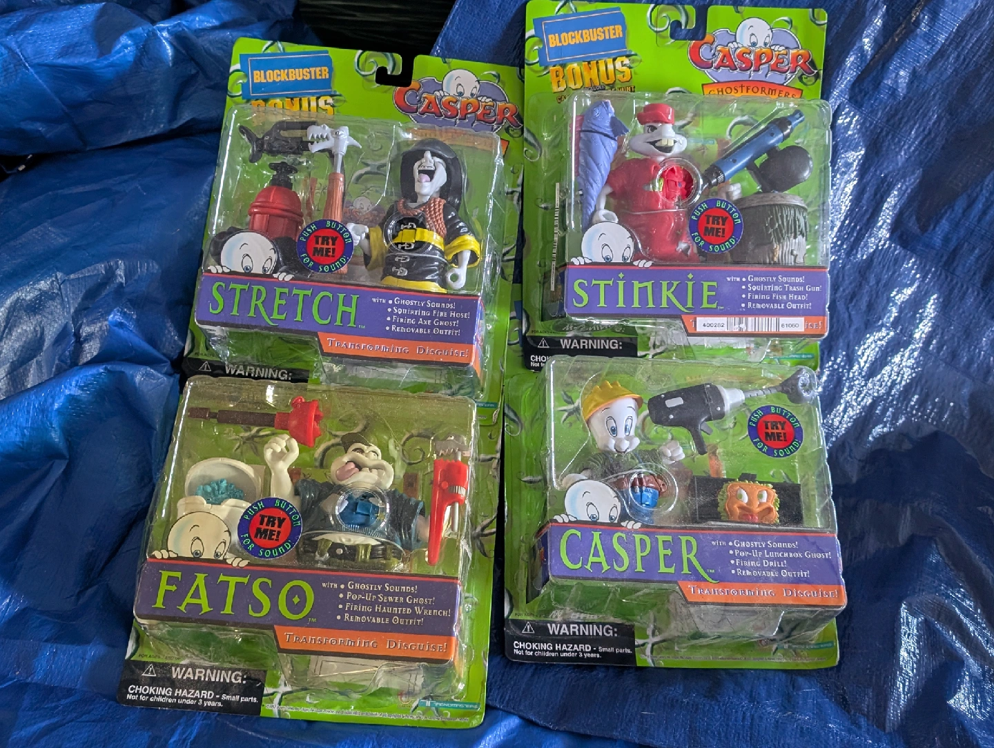 Selling a set of Casper Ghostformers action figures! These are from the 90s and still in their original packaging. Each figure has its own unique features and accessories: - Stinkie: Squirt Gun, Removable Outfit - Fatso: Pop-Up Sewer Ghost, Firing Haunted Wrench, Removable Outfit - Stretch: Squirt Fire Hose, Firing Axe Ghost, Removable Outfit Each figure also has a button that activates ghostly sounds!