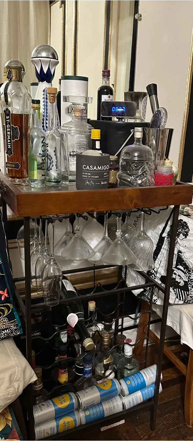 123Cast iron home bar with a removable serving tray made of real Maplewood and glass top. The tray has two cast-iron handles on the sides. The bar can hold glassware located underneath the tray and hold a capacity of 12 bottles as well. This rustic look at a sophisticated element to a room and an elegant way of serving your guests! Home bar Bottle rack Bar with serving tray Hanging Champagne glass holder Hanging Wine glass holder Living room bar Decorative home bar
