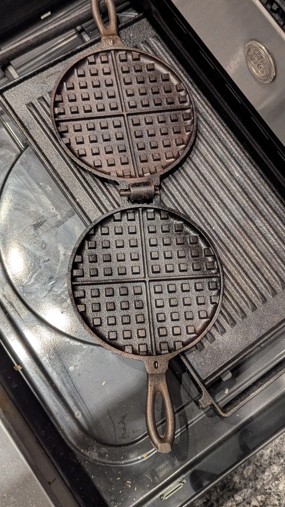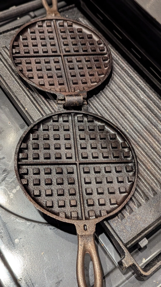 117A cast iron waffle maker, very well seasone. Features a circular shape. Has a hinge and handle. Imagine the delicious waffles you could make with this.