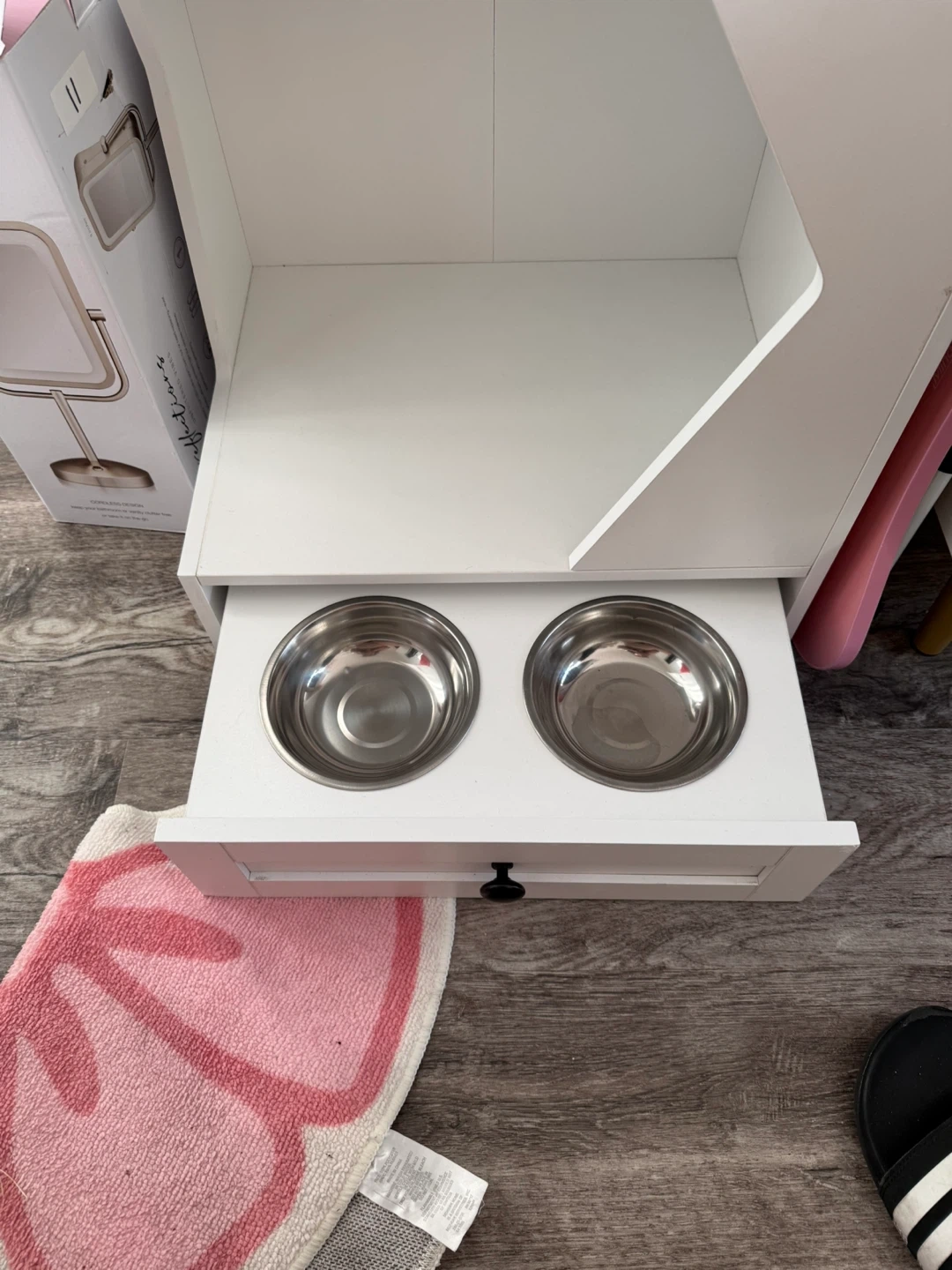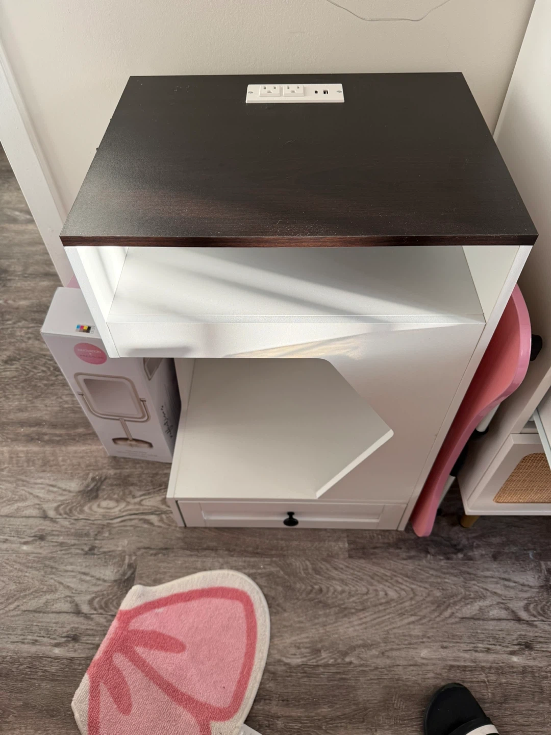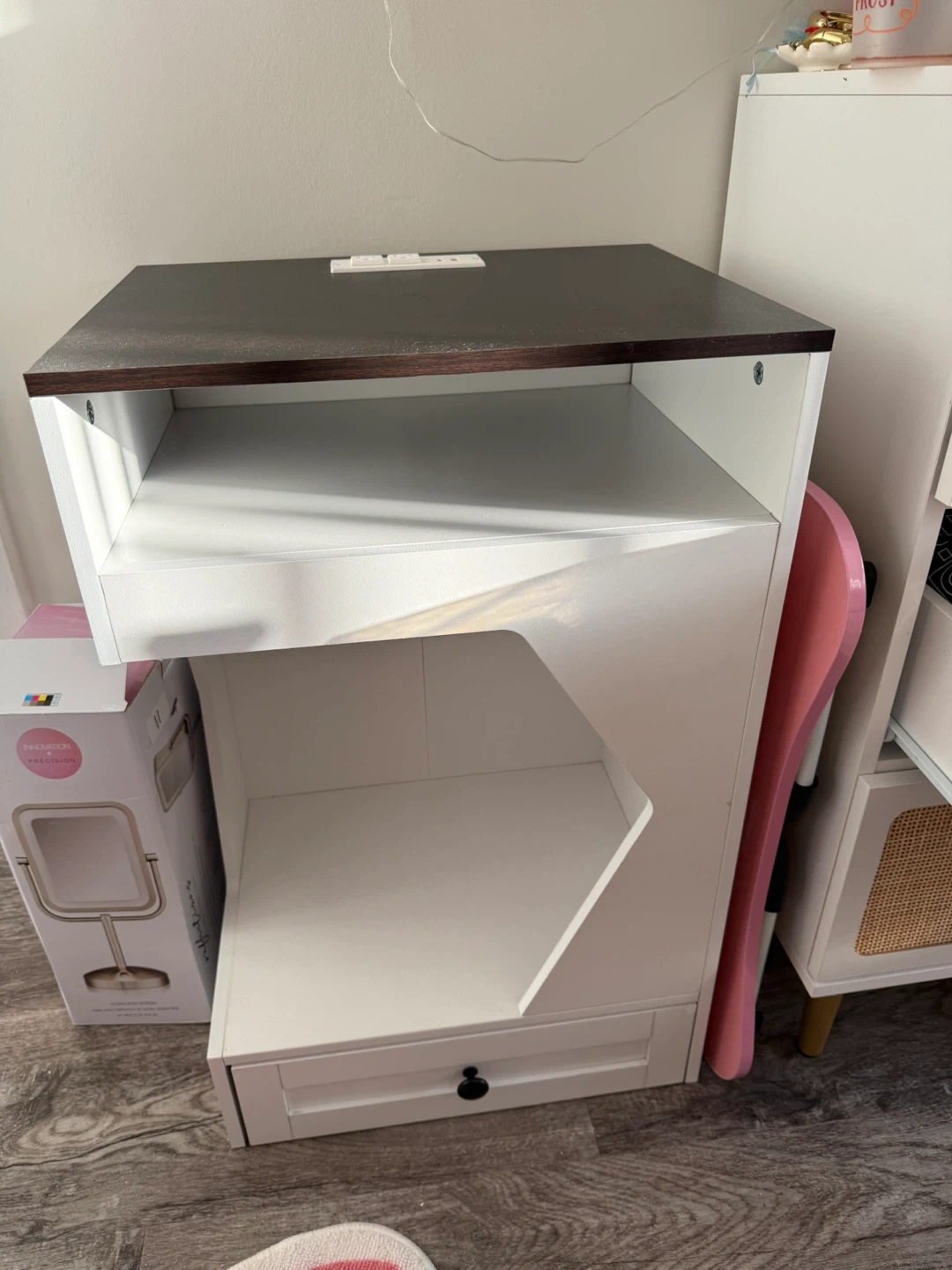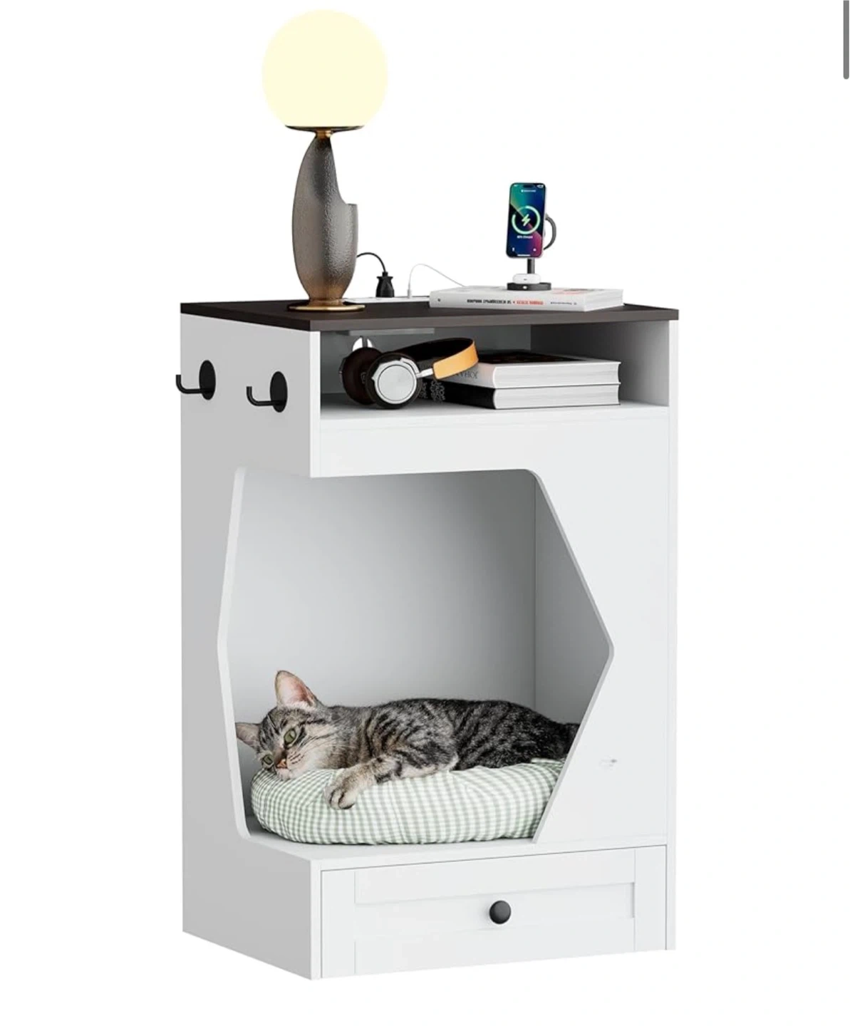 This is a nightstand with a built-in cat bed! It features a white frame with a dark brown top. The nightstand has a drawer, an open shelf, and a cozy space for your feline friend to relax