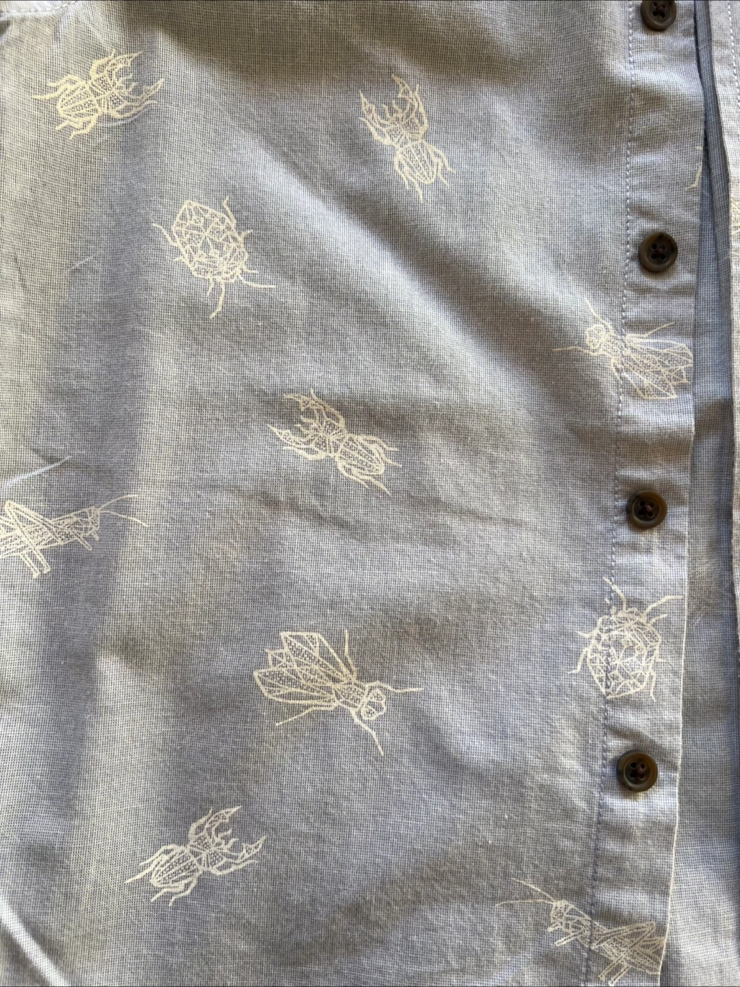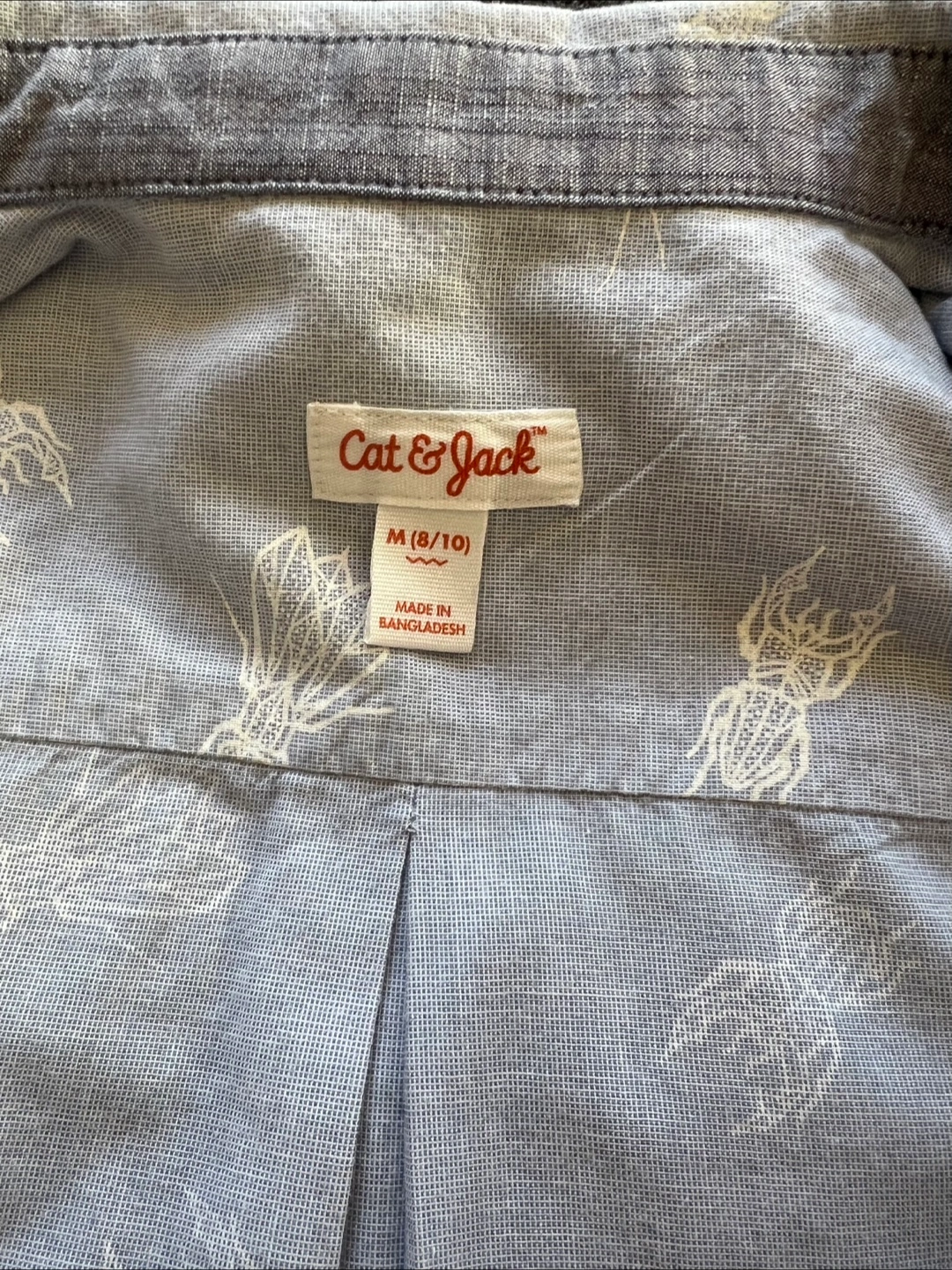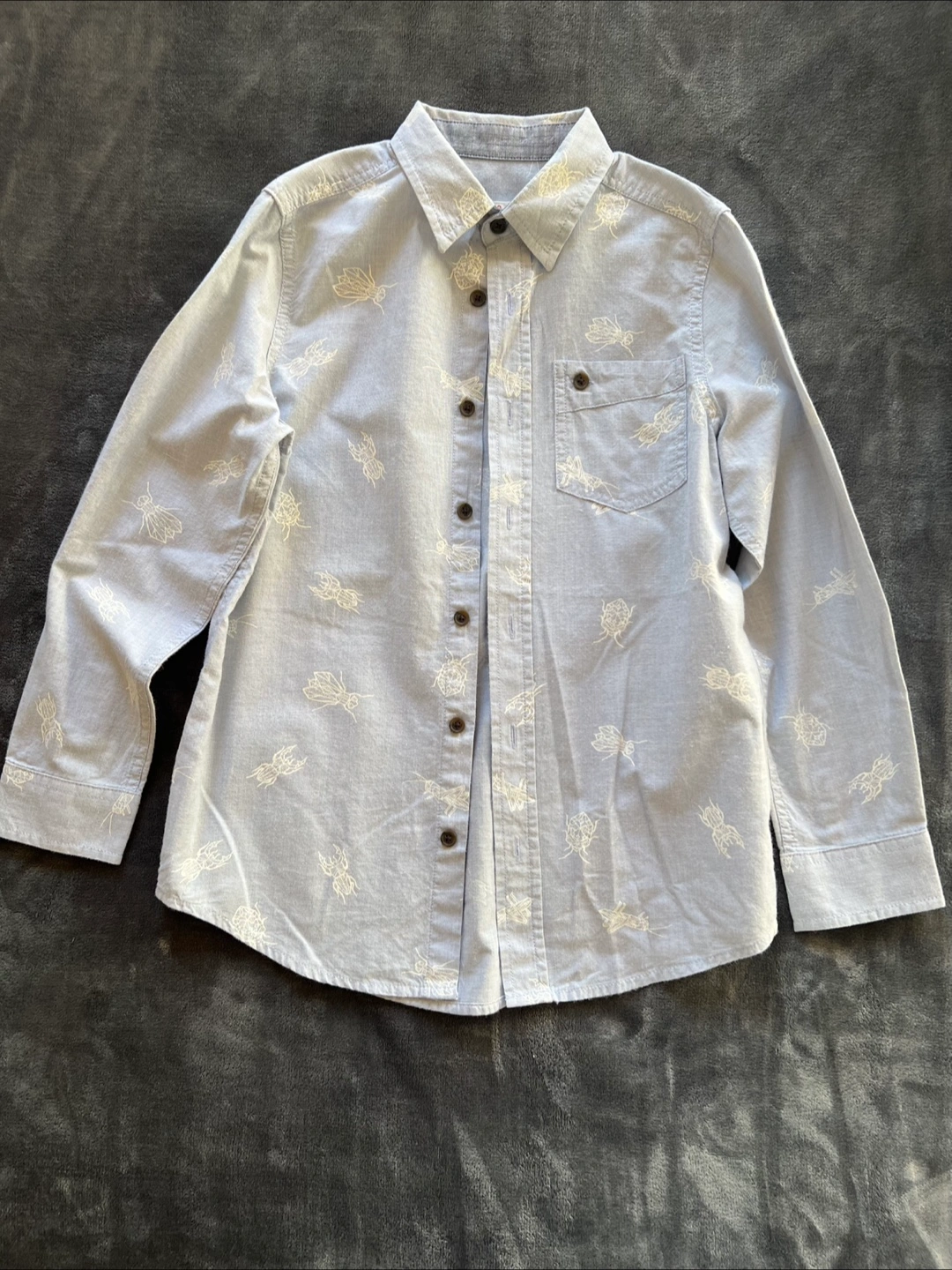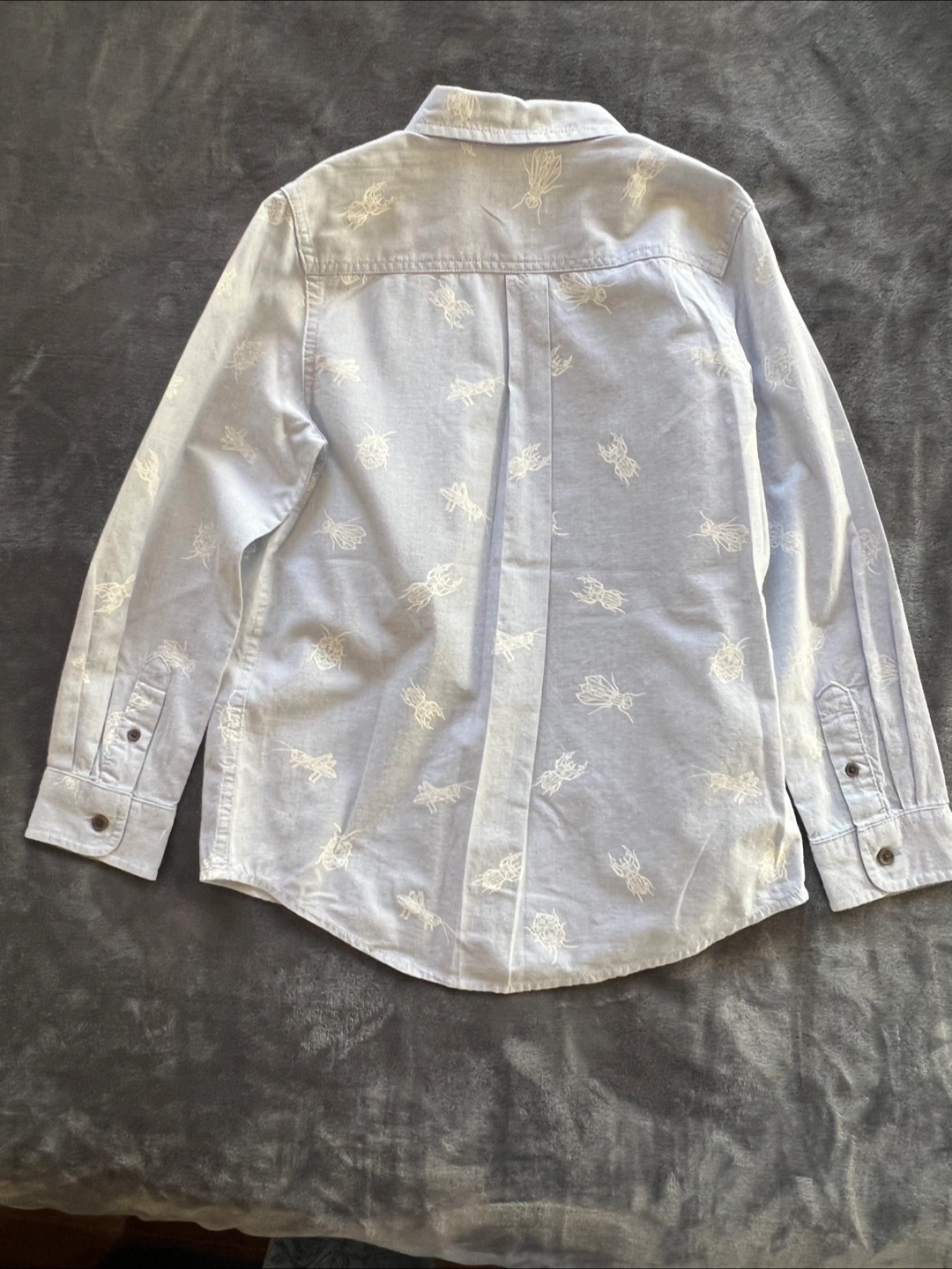 Here's a cute button-down shirt from Cat & Jack! It's a size M (8/10) and features a light blue color with a fun insect pattern. Perfect for everyday wear!