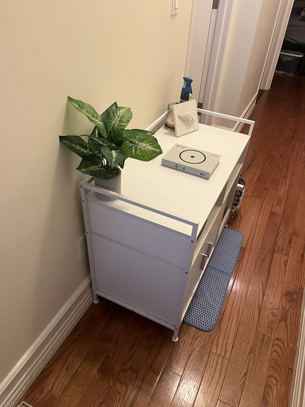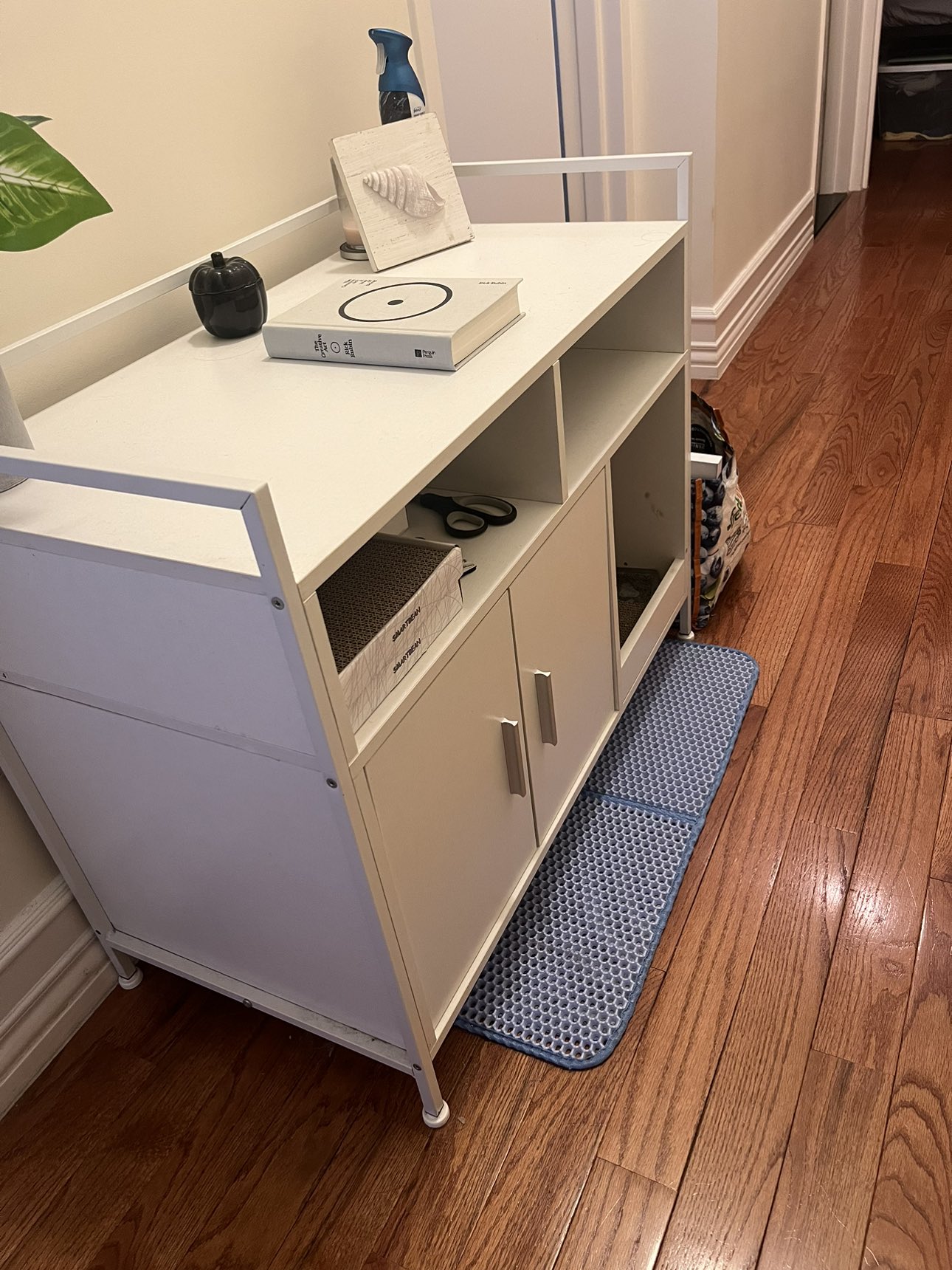 Beautiful white storage to hide litter box with an exit space to stop litter from tracking. Accent furniture. Will be fully sanitized for picked up