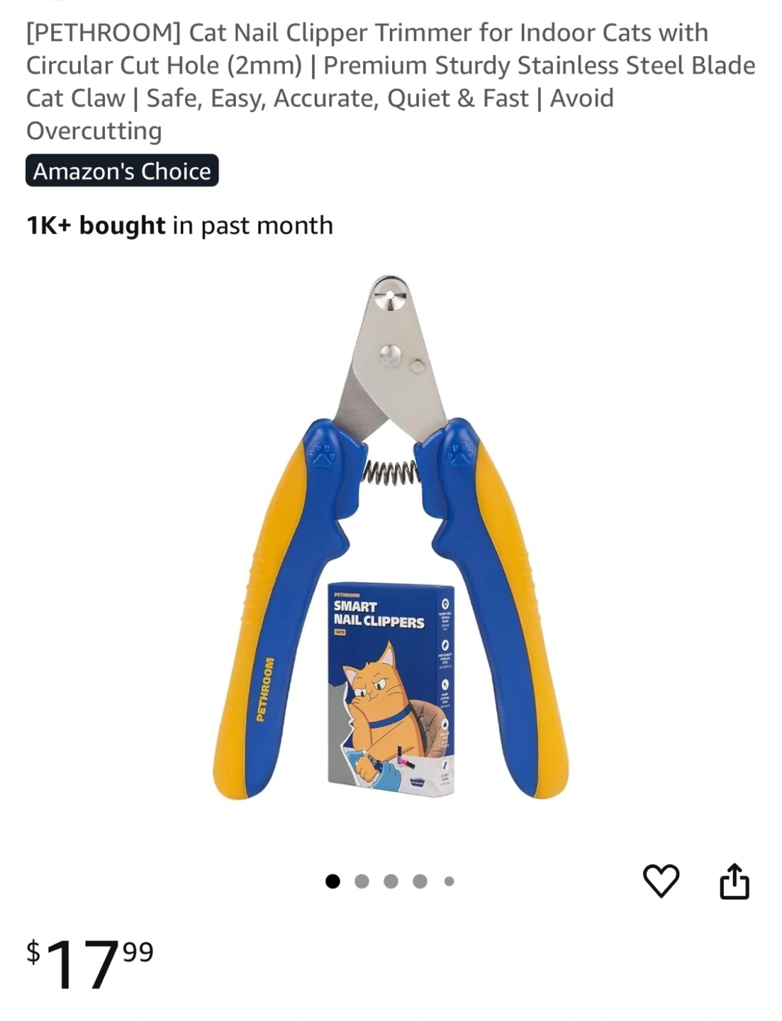 Selling a PETHROOM cat nail clipper trimmer for indoor cats! It has a circular cut hole (2mm) and a premium sturdy stainless steel blade for safe, easy, accurate, quiet, and fast nail trimming. Originally bought for $17.99