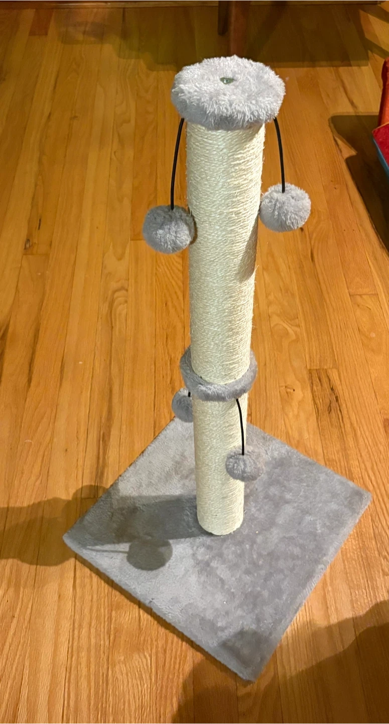 60Selling a cat scratching post in good condition. It features a sturdy base and a sisal-wrapped post for scratching. There are also some cute, fuzzy ball toys attached for extra fun!