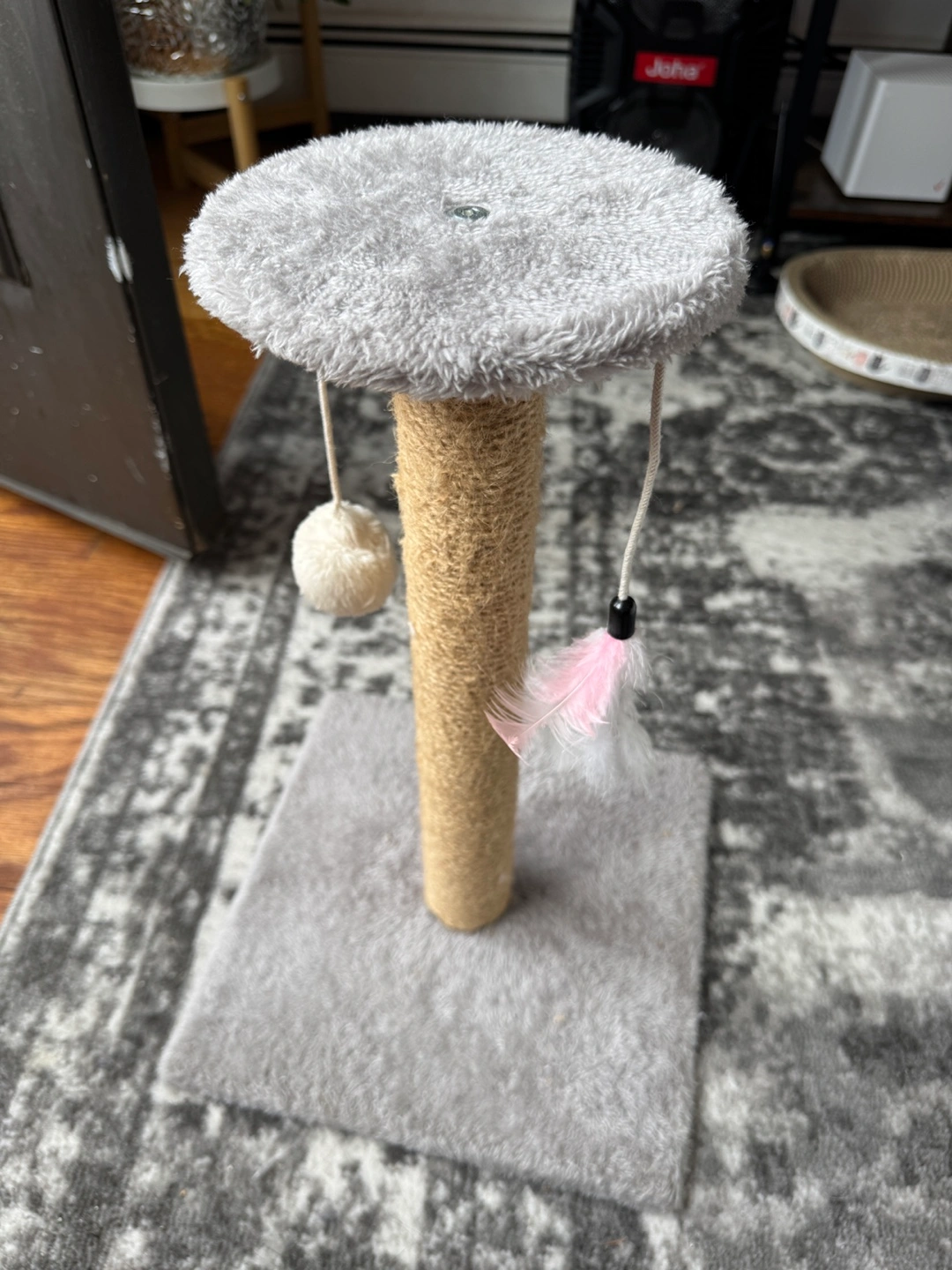 15Small cat scratching post. Features sisal scratching post, grey carpet base and top, and hanging toys. Perfect for kittens or small cats.