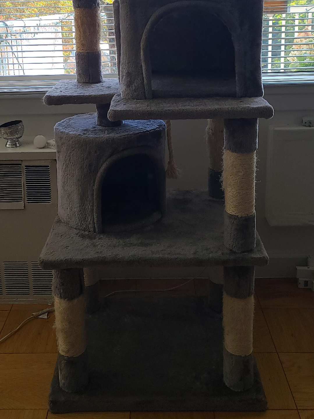 This is a cat tree with multiple levels and scratching posts for your feline friend to enjoy! It features a cozy condo for napping and multiple platforms for climbing and playing. The scratching posts are wrapped in durable material to keep your cat's claws healthy and away from your furniture
