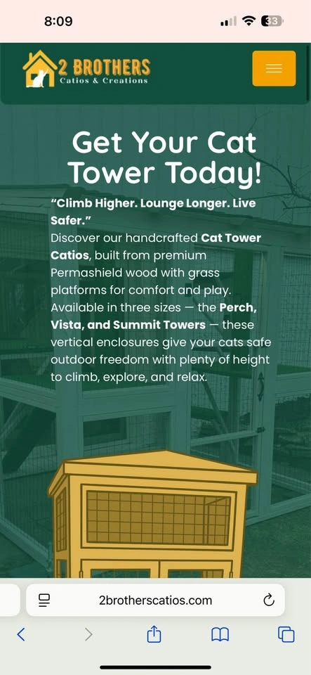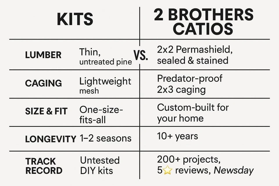 At 2 Brothers Catios, we create custom cat towers, window boxes, and full outdoor catios 🐾. Each project is handcrafted using sealed & stained Permashield wood and predator-proof caging, designed to last 10+ years. Think of it as a luxury home addition for your cats, not a temporary playpen. 🌿 🐱 With 200+ projects built, ⭐⭐⭐⭐⭐ reviews only, and even a Newsday feature, our work speaks for itself. ✅ 1. Premium Lumber (vs. cheap pine) We use 2x2 Permashield wood that’s sealed & stained — built to last 10+ years outdoors. Kits usually come with thin, untreated pine that warps, rots, or cracks within a season or two. ✅ 2. Predator-Proof Caging (vs. flimsy wire) Our enclosures are reinforced with 2x3 predator-proof caging. Kits often use lightweight mesh or chicken wire that can be chewed, bent, or broken through — leaving cats vulnerable. ✅ 3. Size & Custom Fit (vs. one-size-fits-all) Every project is made-to-order for your space. Kits are generic, undersized, and can’t adapt to your home’s layout. With us, you get the design that actually works for your cats and property. ✅ 4. Longevity & Durability (vs. disposable builds) Kits typically last 1–2 seasons max. Our builds are weatherproofed, solid, and designed for decade-plus use. Buy cheap = buy twice. Buy quality = buy once. ✅ 5. Proven Track Record (vs. untested DIY kits) We’ve built 200+ custom projects with 🤩⭐️⭐️⭐️⭐️⭐️ reviews only, and even been featured in Newsday.