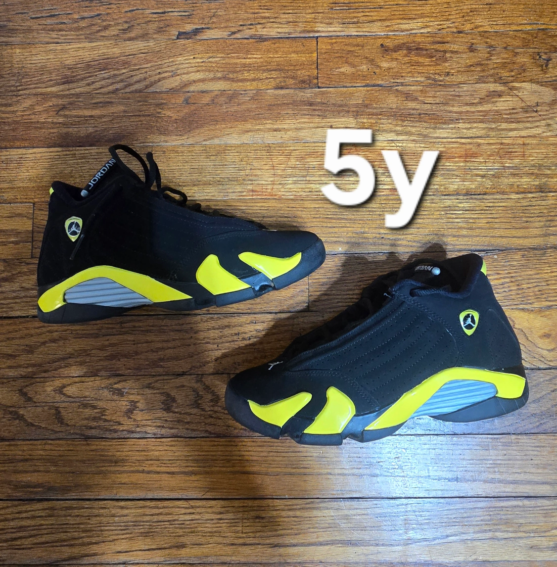 Selling a pair of Jordan 14 Retro sneakers in black and yellow. They are a size 5Y and in good condition. These are a stylish and comfortable choice for any young sneaker fan. Comes with box.