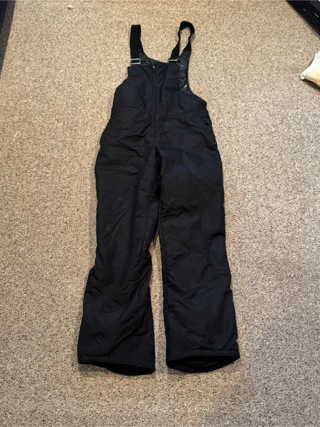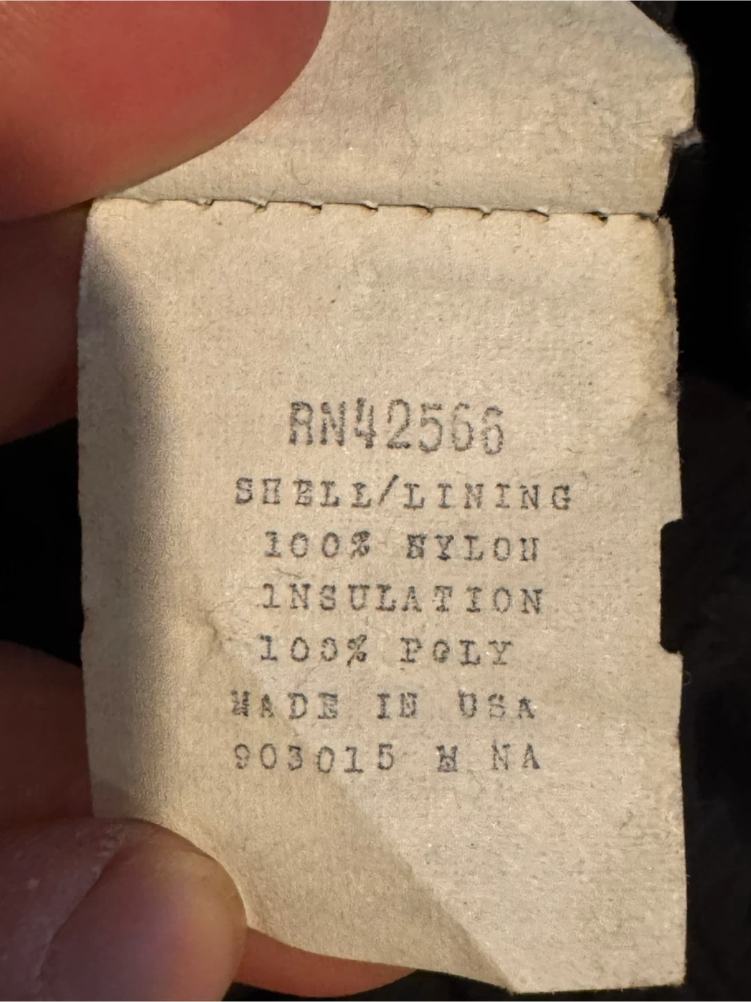 Made of 100% nylon shell and lining with 100% poly insulation. There is a small tear as shown in the photos. In good condition otherwise Fits up to size 38 I’m a size 32 and it fit me well