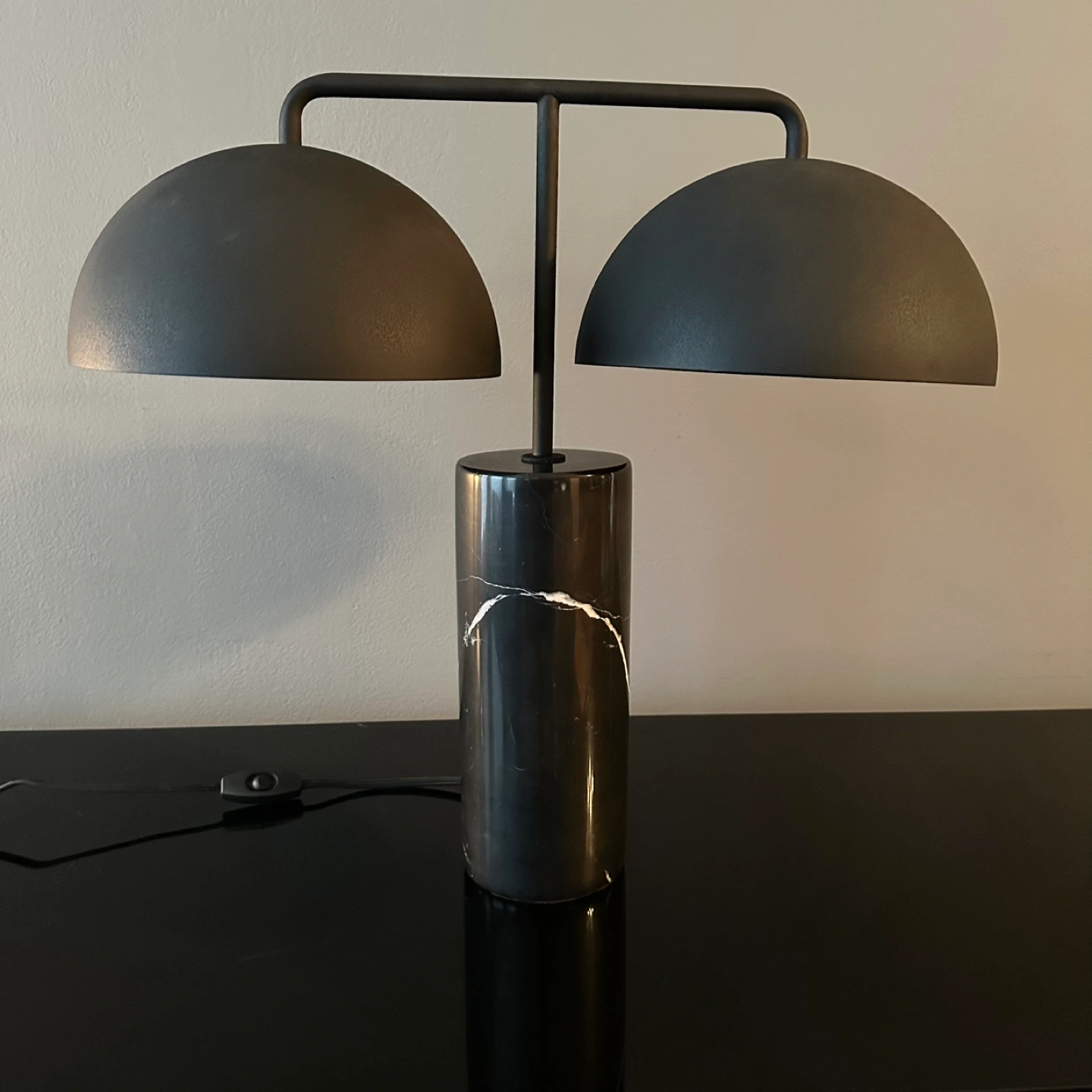 Library table lamp in a sleek monochromatic mix of black marble and textured metal shades. Proof that old ideas can be modernized with a few simple tweaks to color and design. CB2 exclusive. 22"Height 10"Wide 20"Depth * Designed by Mermelada Estudio * Solid Marquina black marble base * Two iron shades with textured matte black finish * Variation in veining and activity of marble is to be expected; each will be unique * Accommodates two 9W LED bulbs (not included) or two 60W max incandescent bulbs (not included) * Black fabric cord with inline switch * UL Listed Learn more. * Dust with a soft cloth; no abrasive cleaners * Imported Originally $279