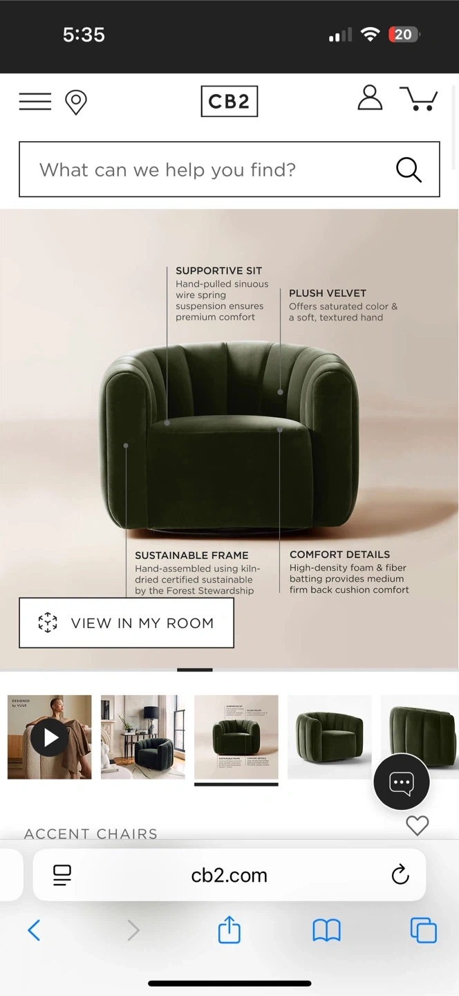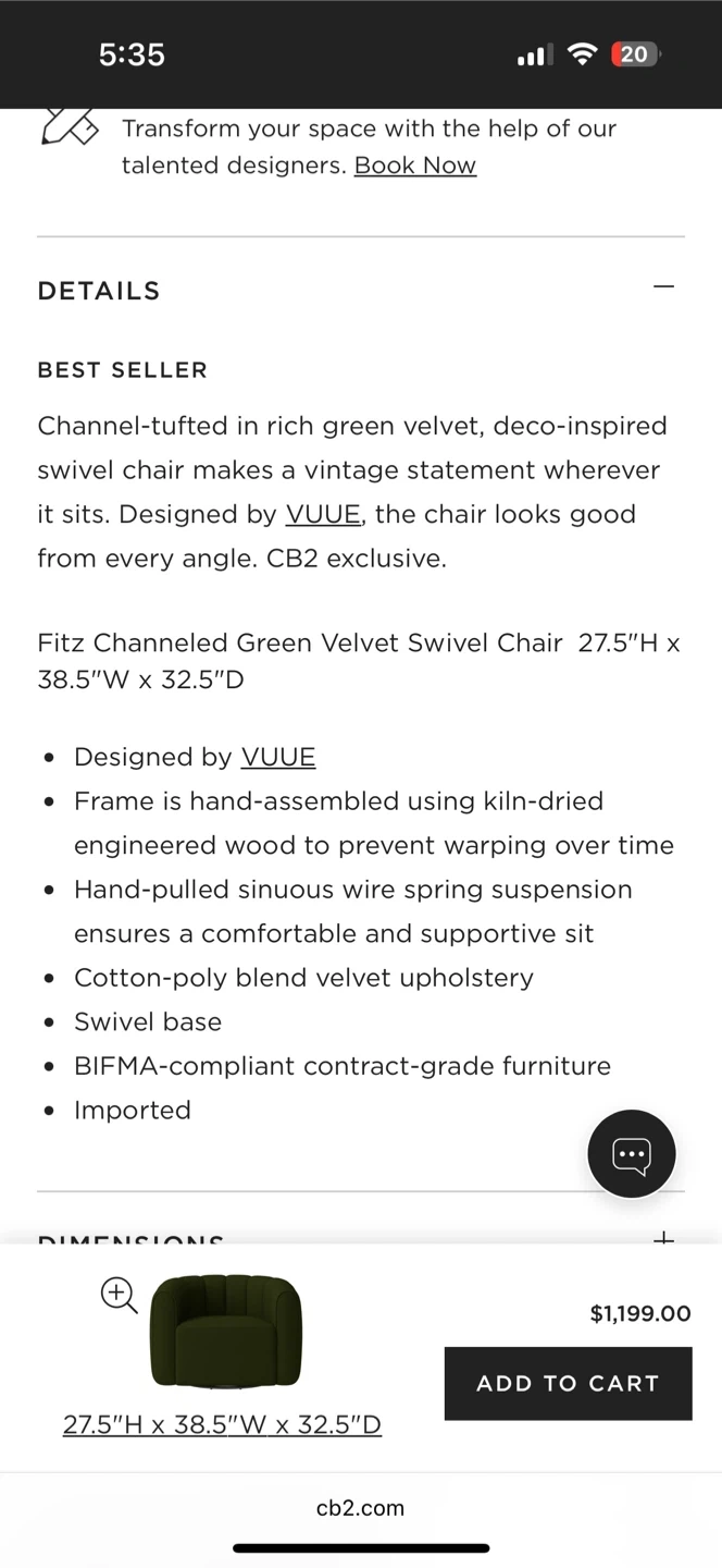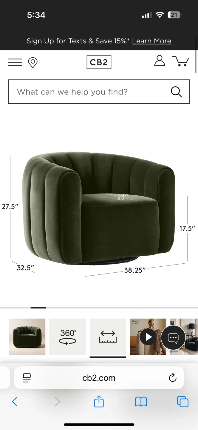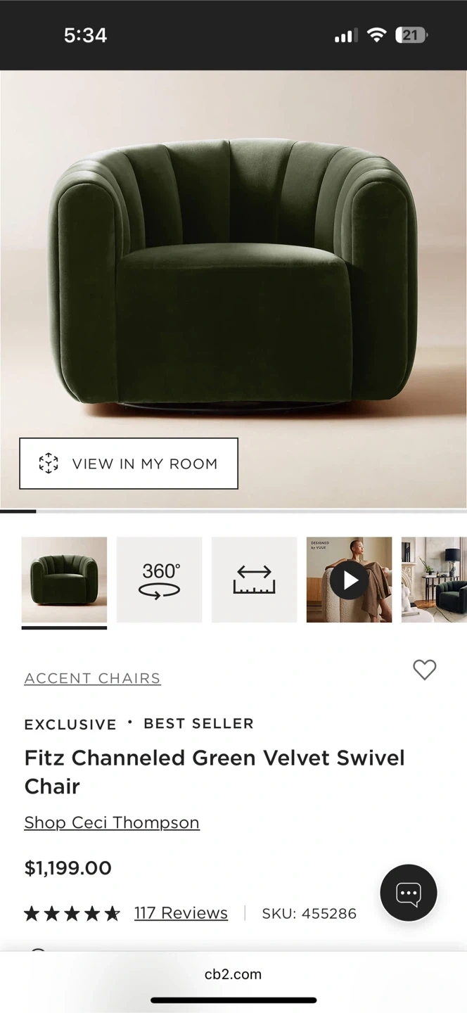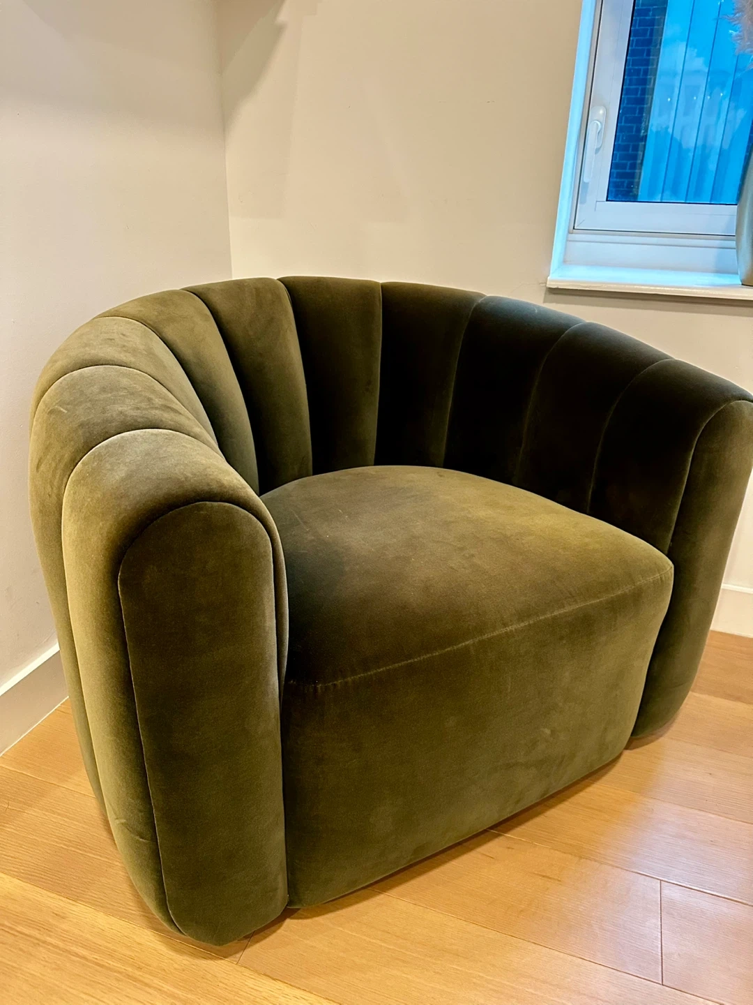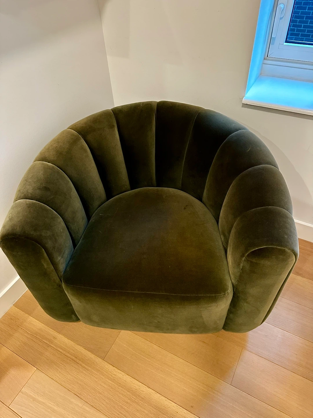 Selling a CB2 Fitz Channeled Green Velvet Swivel Chair. It’s SUPER comfortable!!! It features a supportive sit with hand-pulled sinuous wire spring suspension, ensuring premium comfort. The plush velvet offers saturated color and a soft, textured hand. The frame is hand-assembled using kiln-dried certified sustainable by the Forest Stewardship Council. High-density foam & fiber filling provides medium-firm back cushion comfort. Originally bought for $1,199. In a very good conditions.