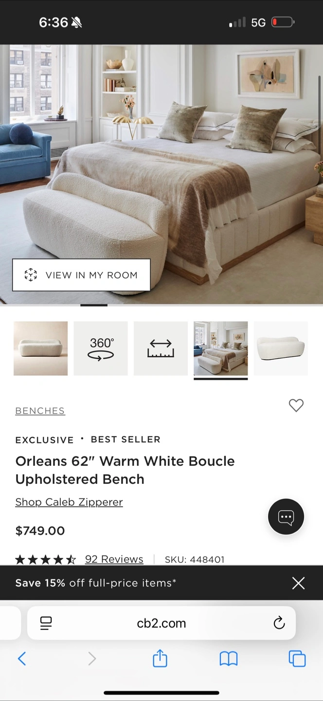 Selling a CB2 Orleans 62" Warm White Boucle Upholstered Bench! It's in great condition and ready for a new home. This bench is an exclusive best seller from CB2. Originally bought for $749, this upholstered bench is perfect for adding a touch of elegance to any room