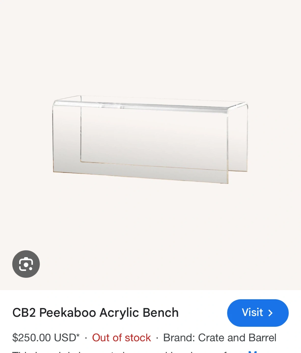 Selling a CB2 Peekaboo acrylic bench. It's in good condition and ready for a new home! This bench is a stylish and modern piece that can be used in a variety of settings. Originally $500