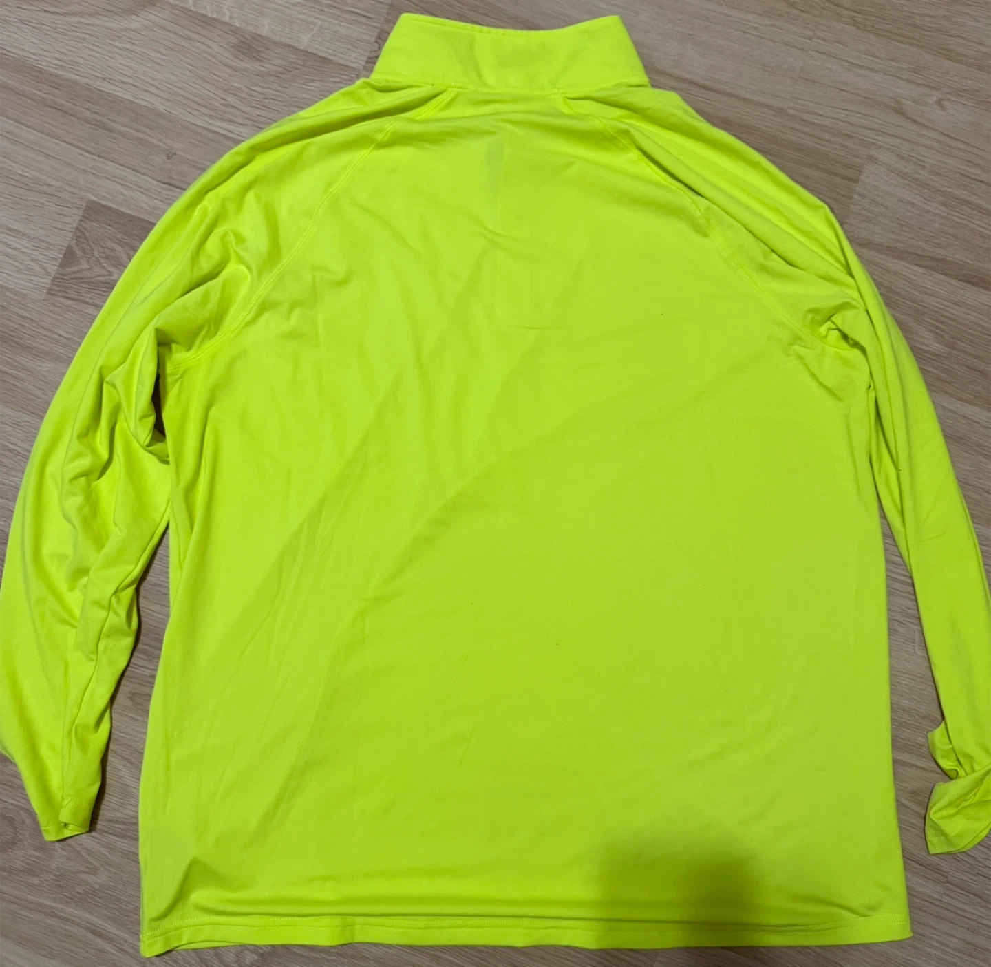 This is a Russell Athletic long-sleeve quarter zip pullover shirt. It's a bright neon yellow color and has a "dri-power 360" moisture-wicking fabric. The size is XL.