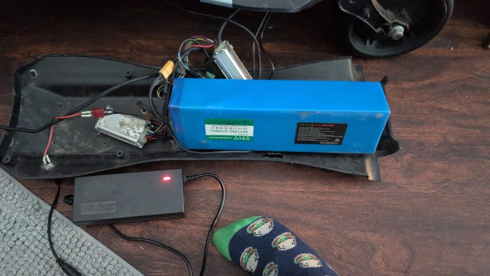 Selling an e-scooter battery and charger. It's a 48V 12AH (576WH) Li-ion battery. The battery pack is a JUBANG brand. Comes with a Multi adapter charger. X3 different plugs..($50).I turned power on my scooter to show it's still works, runs, lots of life...1000 watt..dual brushless motors...that's what I was running...I'm switching to single motor...that's why I'm selling battery and charger...for cheap guys an gals.... have any questions please feel free to contact me.... cheers
