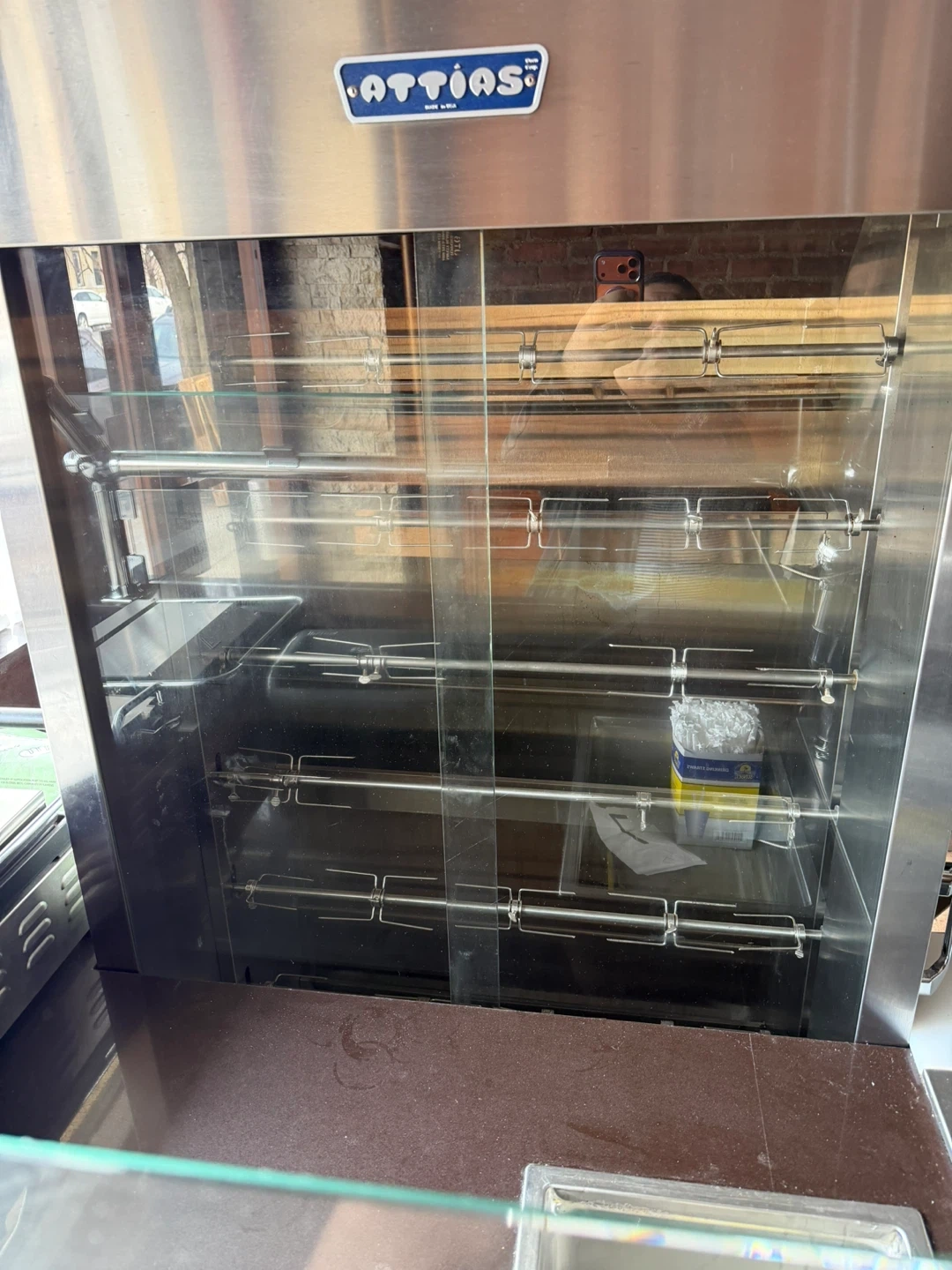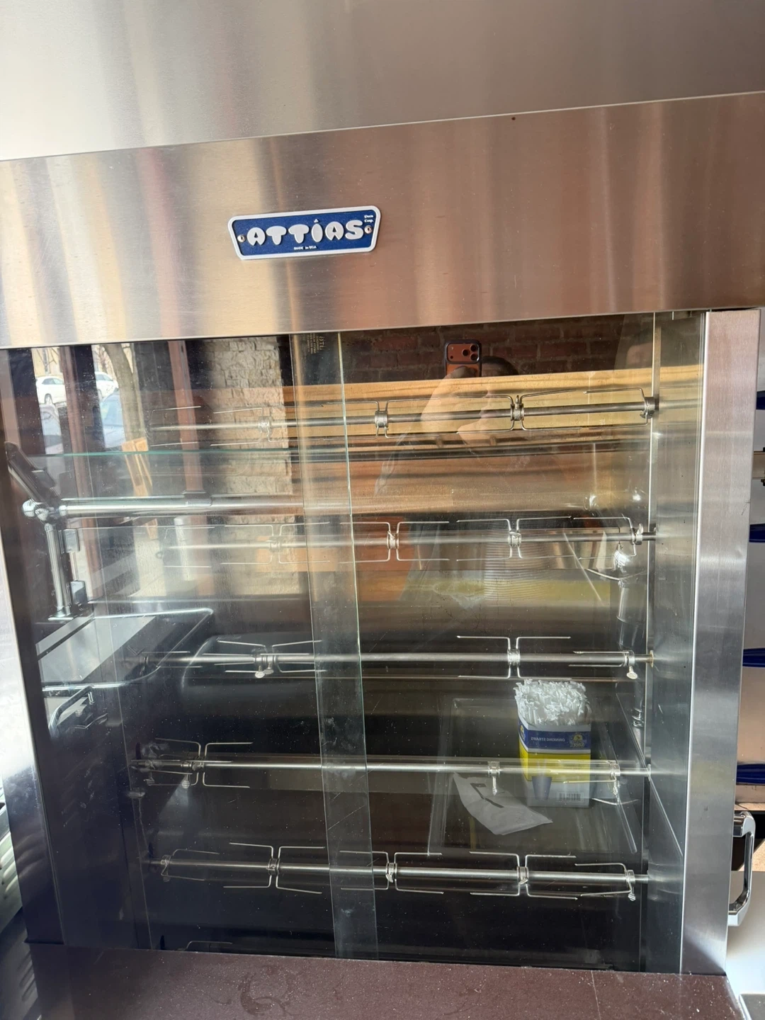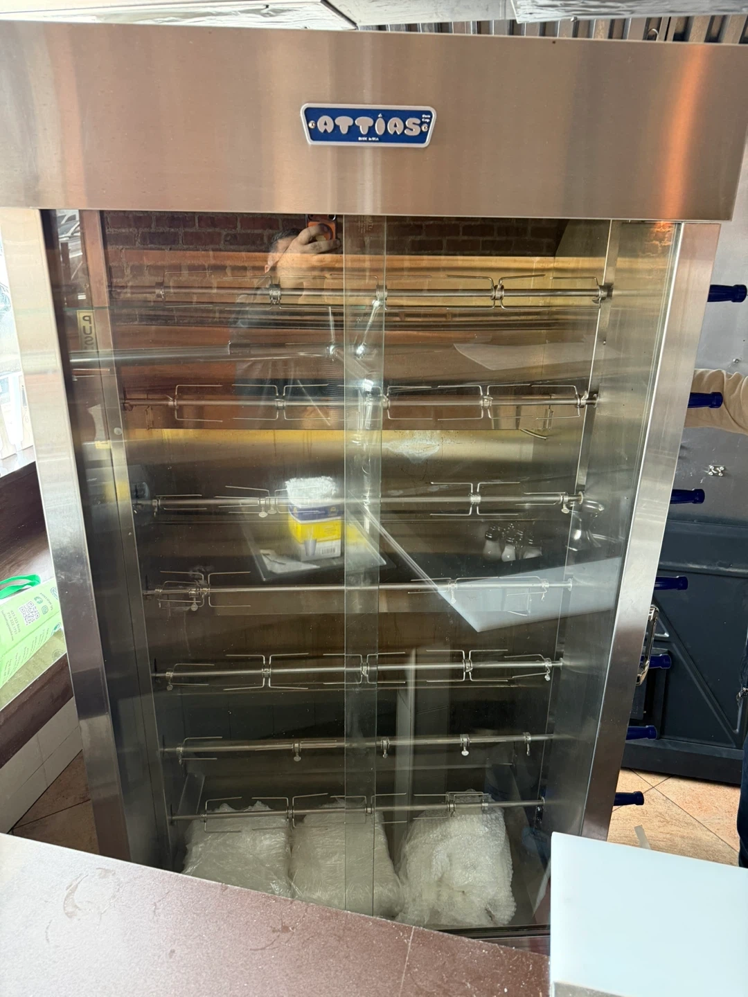 This is an Attias rotisserie oven with multiple spit racks. It's constructed from stainless steel and features a glass display. This appliance is ideal for commercial kitchens looking to prepare rotisserie-style meats.