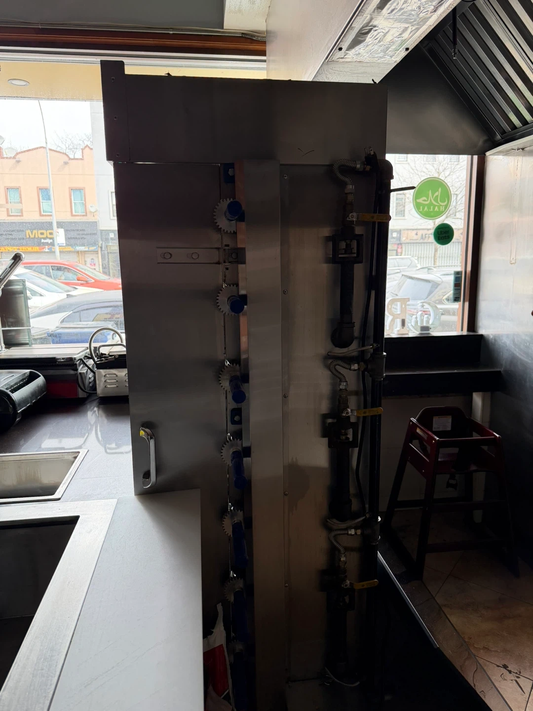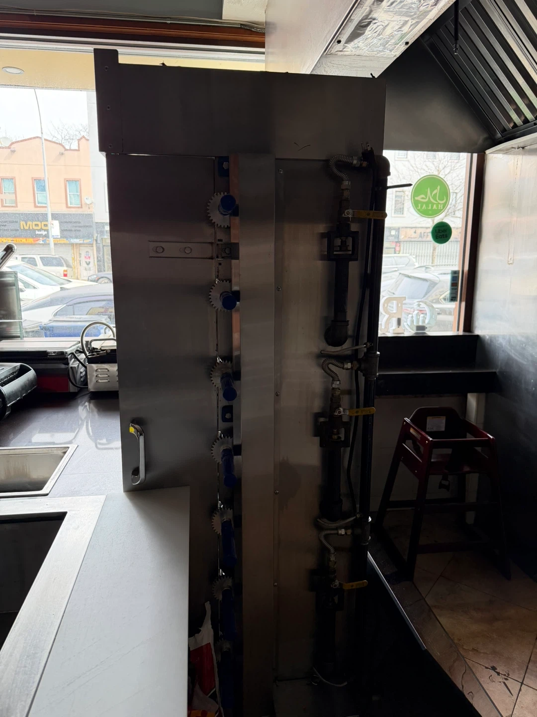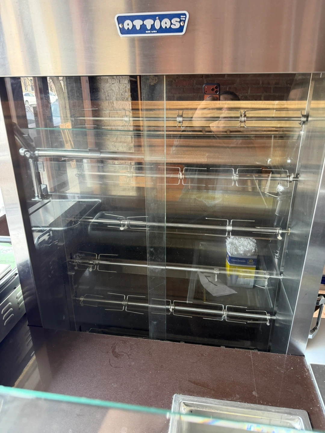 This is an Attias rotisserie oven with multiple spit racks. It's constructed from stainless steel and features a glass display. This appliance is ideal for commercial kitchens looking to prepare rotisserie-style meats.