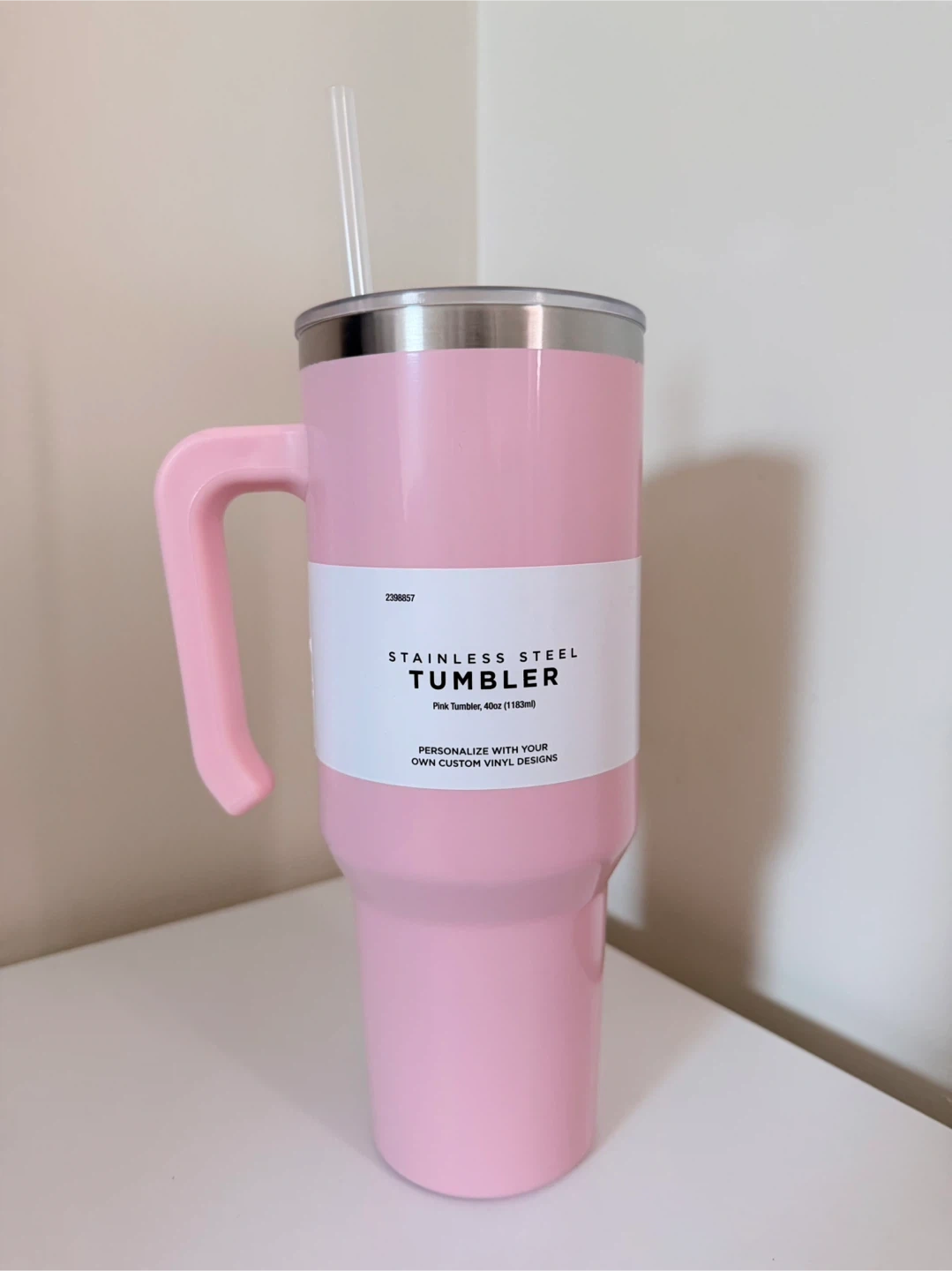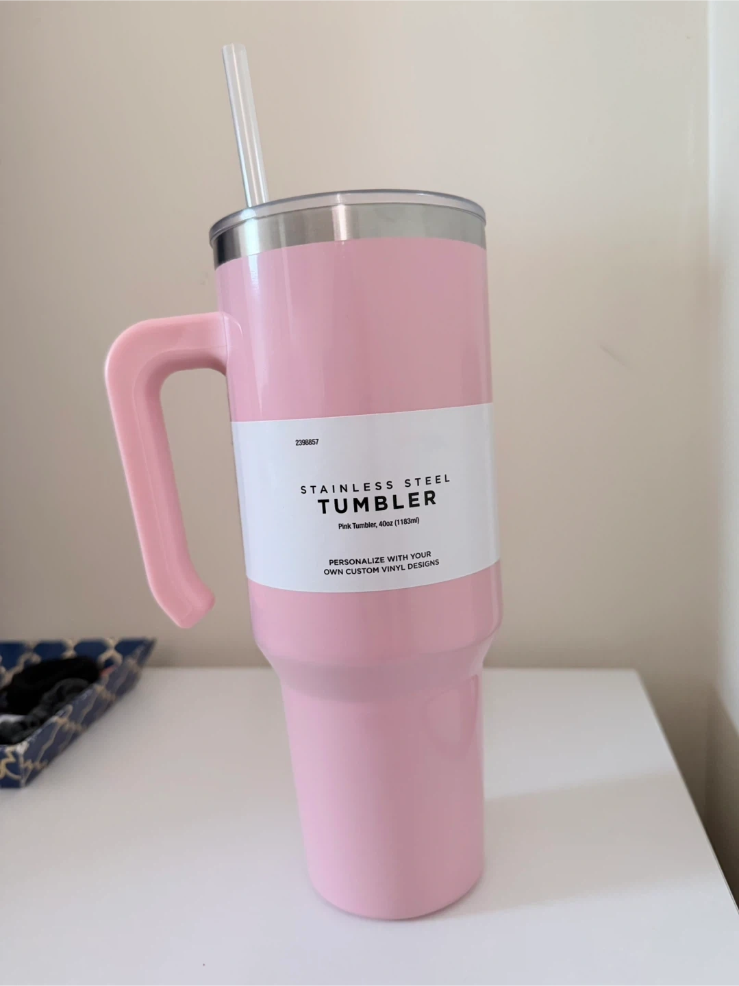 I'm selling a pink stainless steel tumbler that holds 40oz (1183ml). It's perfect for personalizing with your own custom vinyl designs. New, never used.